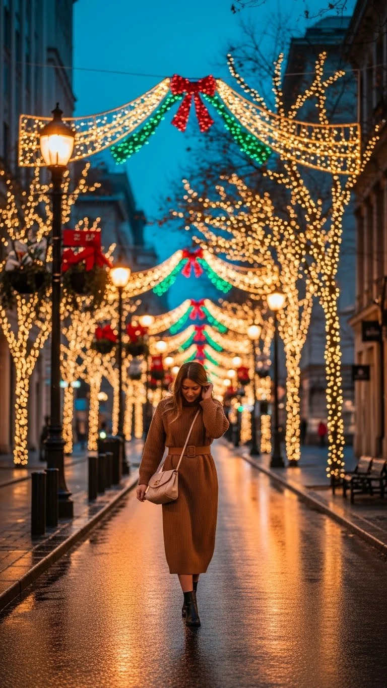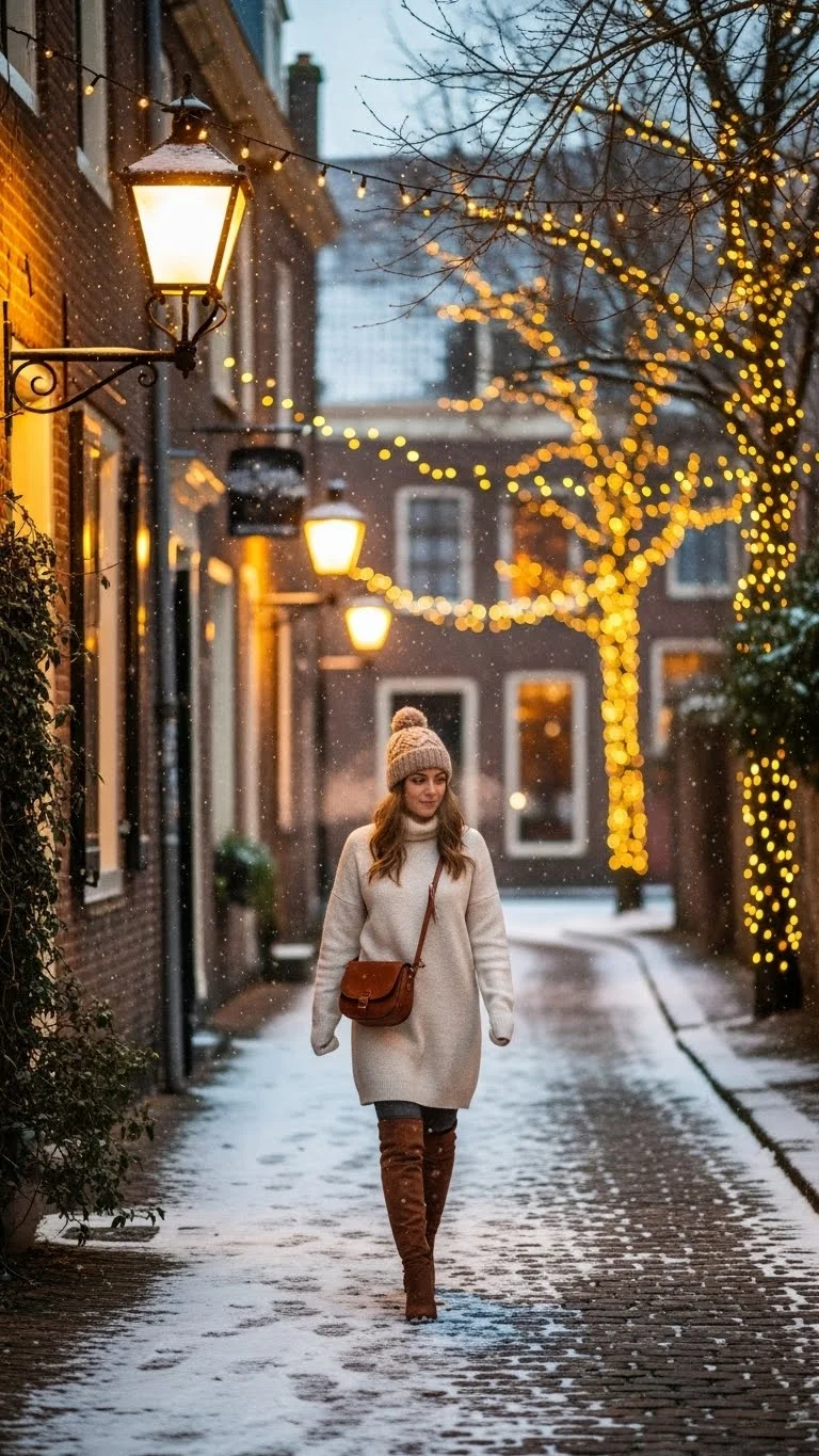 A sweater dress blends comfort and style. Pair it with over-the-knee boots to keep your legs warm and create a flattering line. Stick to neutral colors like cream, beige, or soft gray for a soft romantic look. Add a thin belt for shape or a statement necklace for sparkle. If you don’t own a sweater dress, layer a long oversized sweater over leggings to create a similar silhouette. Top with a long coat or puffer jacket for warmth. This outfit is ideal for casual Christmas walks, coffee dates, or movie nights.