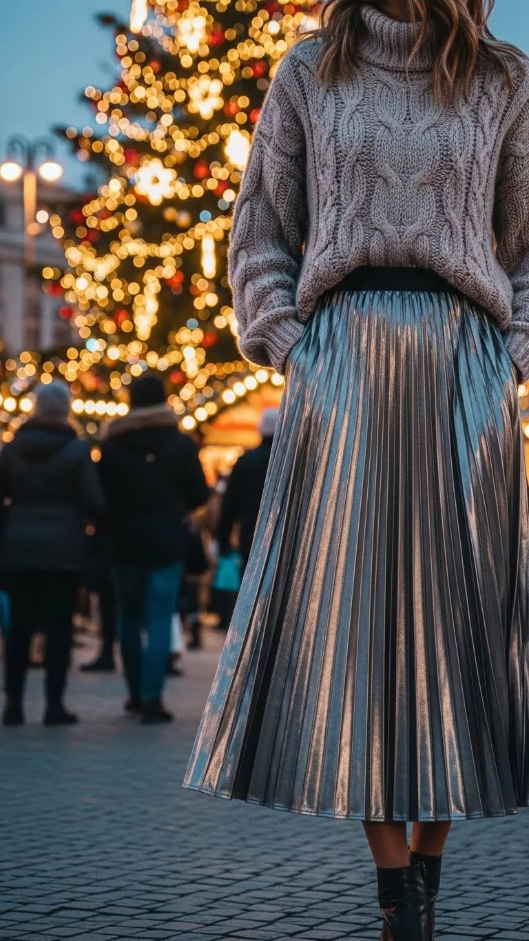 A pleated skirt adds movement and elegance. Pair with a cozy knit sweater tucked lightly at the front. Boots or heels work depending on weather. Add simple earrings or rings. If you don’t own a metallic skirt, choose a patterned pleated skirt for a similar festive effect. Great for evening walks or casual holiday dinners.