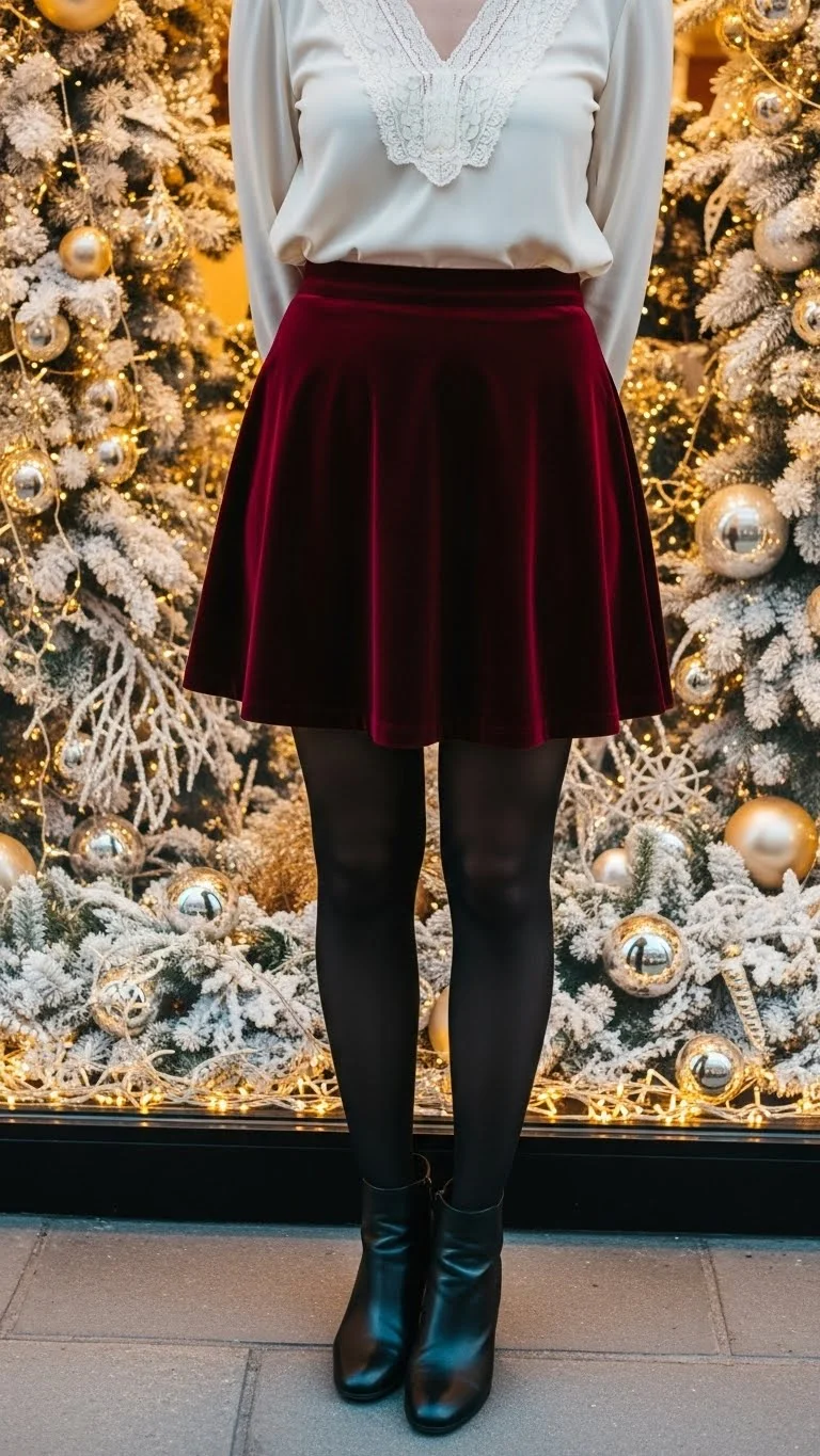A velvet mini skirt feels festive. Pair with a soft blouse for balance. Add tights if needed and ankle boots. For an affordable option, thrift the skirt and pair with a blouse from your closet. This outfit works for casual or semi-formal date nights.