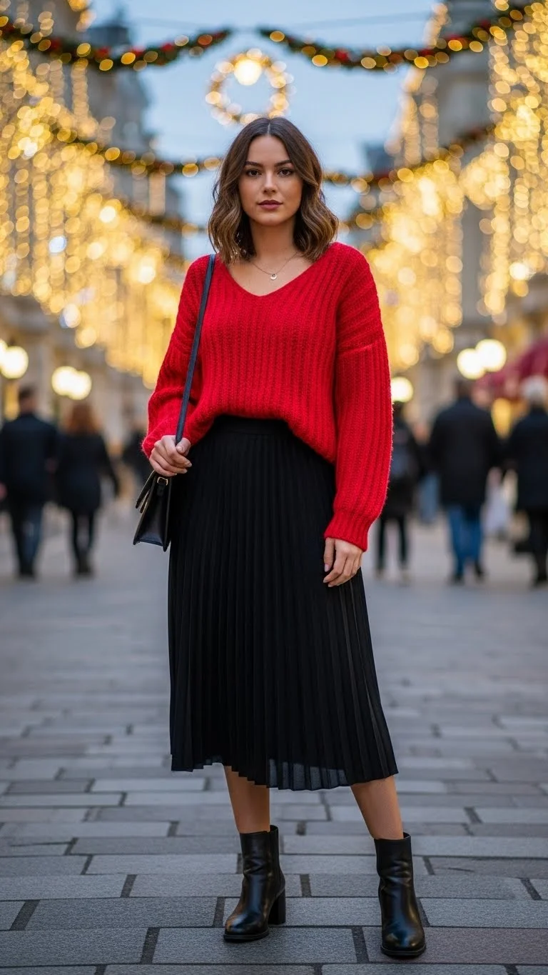 A red knit top adds a seasonal touch. Pair with a simple black skirt and boots. Minimal jewelry complements the outfit. Budget-friendly tip: mix pieces you already own for a festive vibe. Ideal for casual holiday dates.