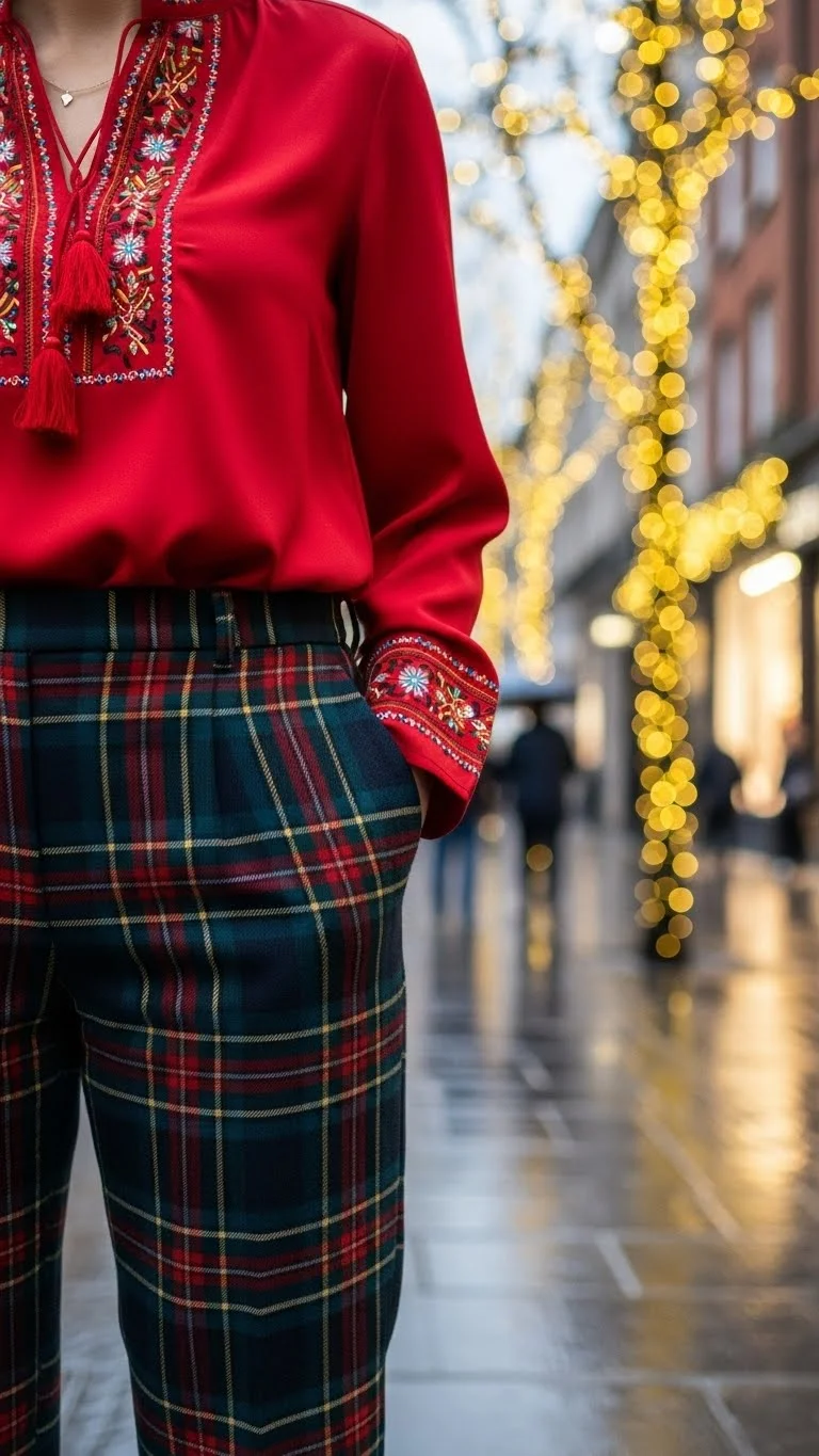A red blouse adds romance to plaid pants. Pair with ankle boots or heels. Minimal accessories allow the outfit to shine. This look works for casual dinner dates or winter walks.