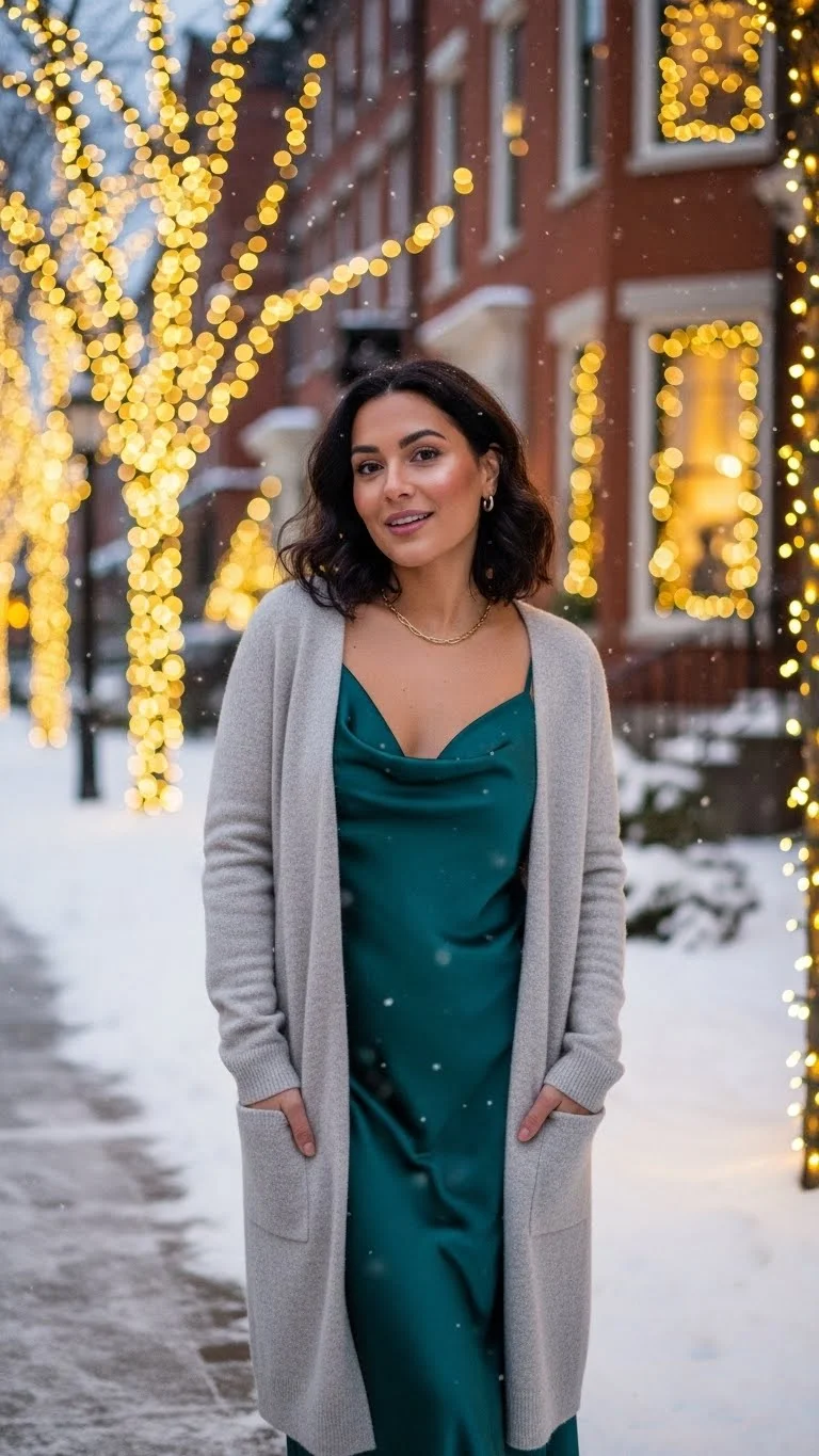 Layering a slip dress under a sweater creates a romantic yet casual winter look. Stick with soft colors—cream, blush, or muted green. Add knee-high boots for warmth. Roll the sleeves slightly and accessorize with thin chains or rings. If you don’t own a slip dress, a silk camisole over leggings with a long cardigan works as a budget-friendly alternative. Perfect for cozy coffee dates or casual strolls.