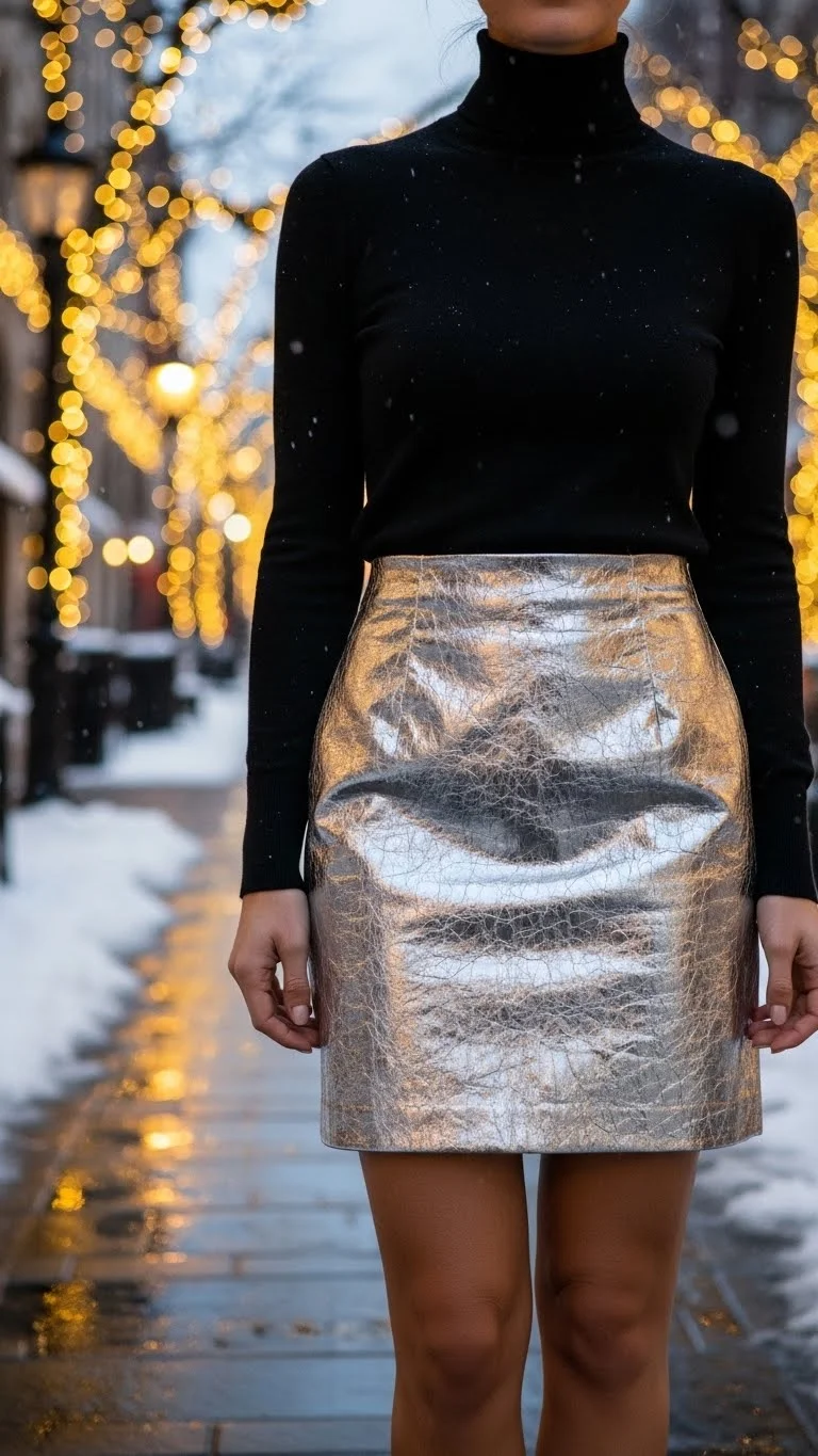 A metallic mini skirt adds subtle sparkle for date nights. Pair it with a fitted turtleneck to balance the shine and keep warm. Black tights and ankle boots keep the look polished and cozy. Add a small clutch for essentials and simple jewelry for a hint of glamour. If a metallic skirt feels out of reach, spray a thrifted skirt with metallic fabric paint for an affordable DIY version. This outfit works for casual or semi-formal dinners and evening strolls by holiday lights.