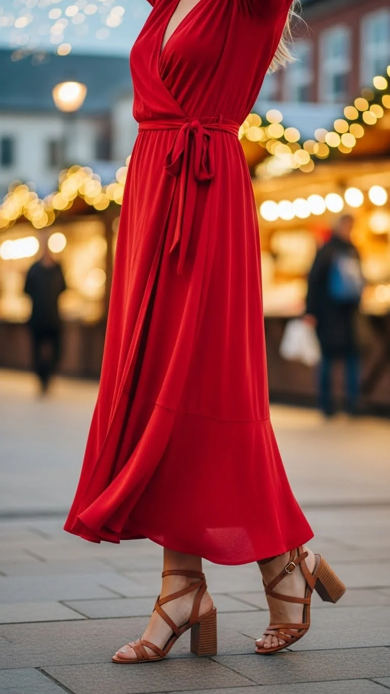 A wrap dress flatters all shapes and feels romantic instantly. The tie waist defines curves, and the red color enhances the festive mood. Pair with neutral heeled sandals or ankle boots depending on weather. Simple gold or silver jewelry completes the outfit. If you don’t have a wrap dress, try wrapping a long cardigan over a fitted dress for a similar effect. This outfit works for intimate dinners, wine bars, or evening walks.