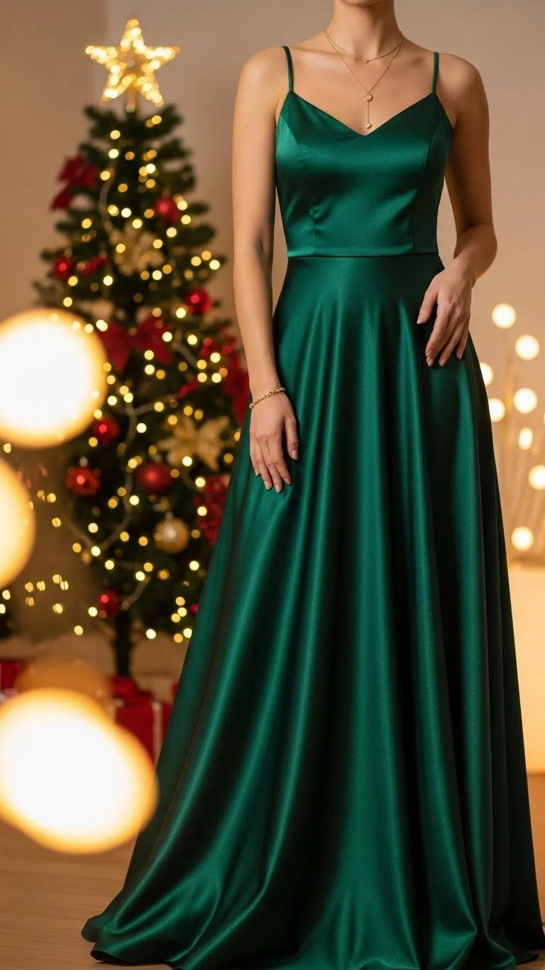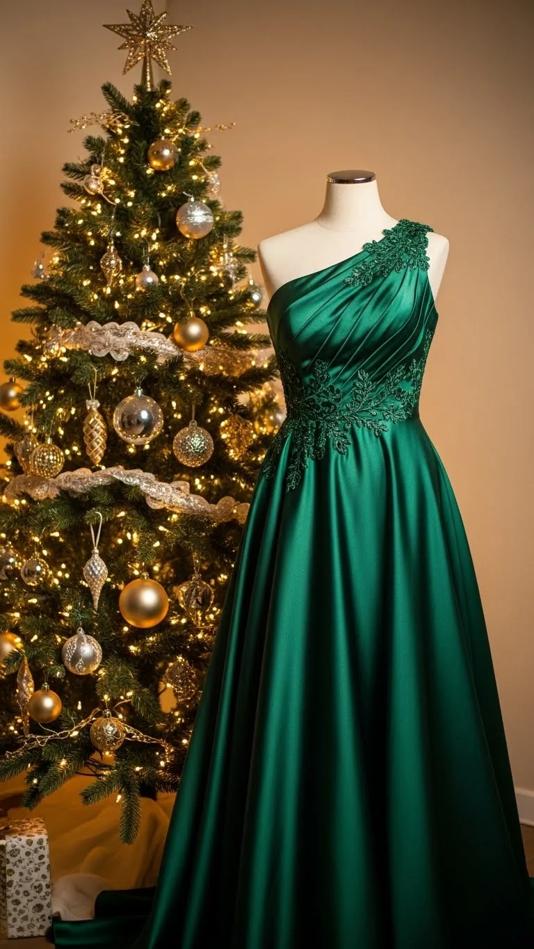 One-shoulder gowns create asymmetry for a modern touch. Pair with simple gold earrings or a bracelet. Add matching heels to keep the look streamlined. If the dress is plain, attach a subtle brooch or metallic belt for extra flair. Hair styled to the opposite side of the shoulder strap emphasizes the shape. Ideal for formal holiday dinners and cocktail parties. Green pairs well with warm holiday lighting, creating a festive yet elegant vibe.