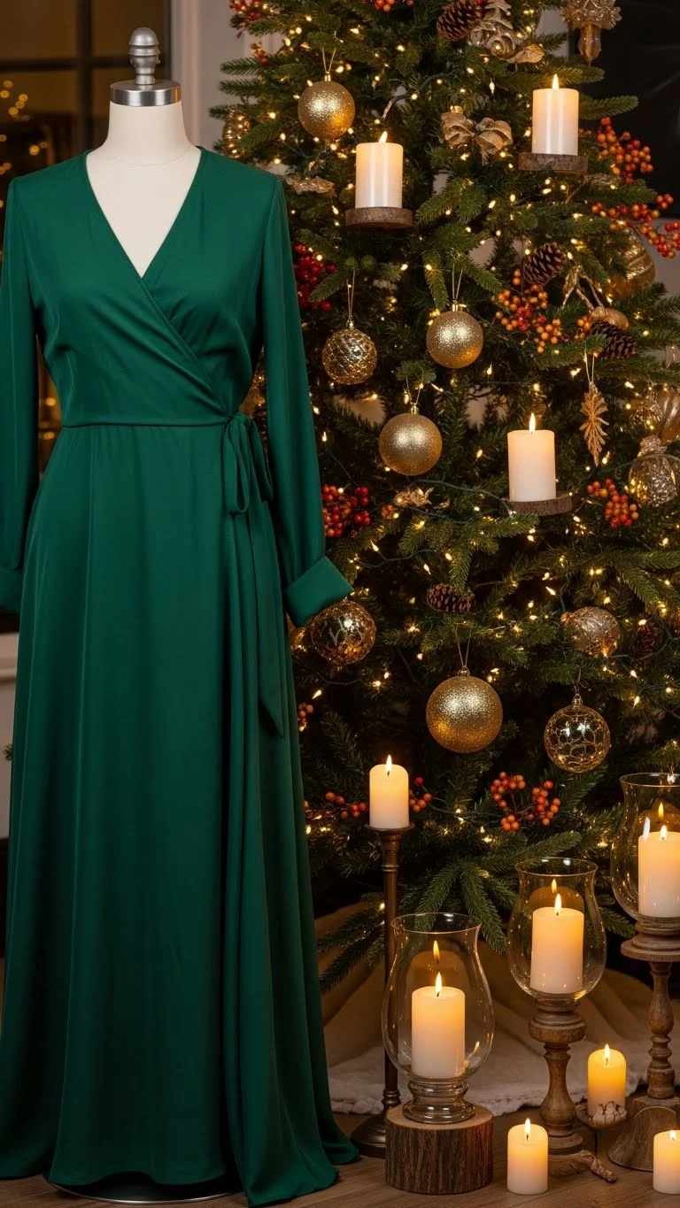 A wrap dress is flattering and easy to adjust. Choose a forest green shade for Christmas parties. The long sleeves keep you warm without needing a jacket. Add gold hoops or delicate earrings. For shoes, nude or gold heels work best. If the dress is plain, add a thin metallic belt or pin a brooch at the waist. You can DIY a waist tie with velvet ribbon for under $5. Carry a small bag in gold or beige. For hair, try loose curls or a low bun. This outfit works for both formal dinners and upscale gatherings. The wrap shape looks neat in photos and comfortable for long events.