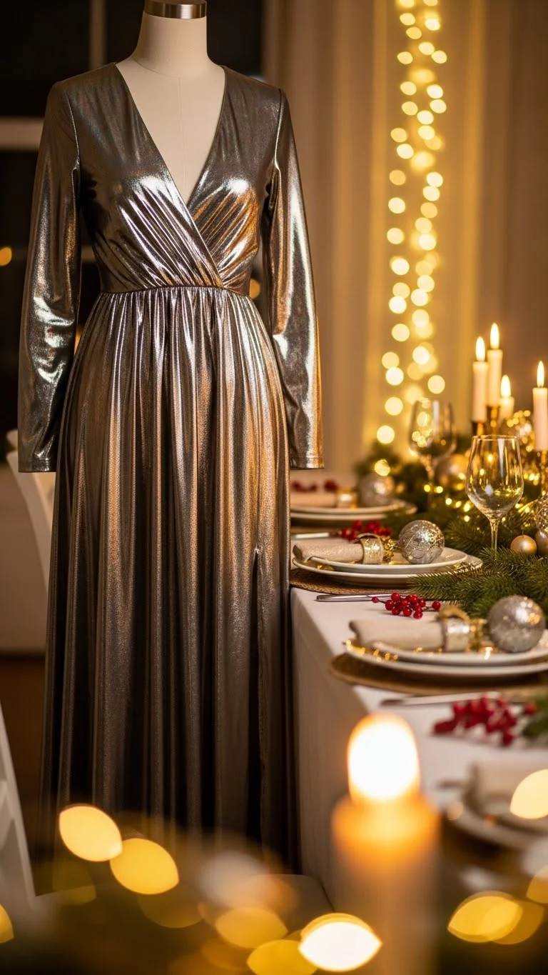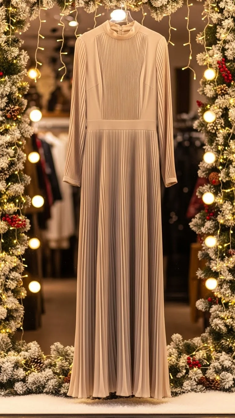 Pleated dresses create movement and elegance effortlessly. Champagne tones reflect soft holiday lights. Pair with neutral heels and minimal jewelry. If plain, add a metallic or ribbon belt to accentuate the waist. Hair in a half-up style complements the flow of the pleats. Ideal for formal dinners or cocktail parties. The pleats add visual interest and elegance without needing extra accessories.