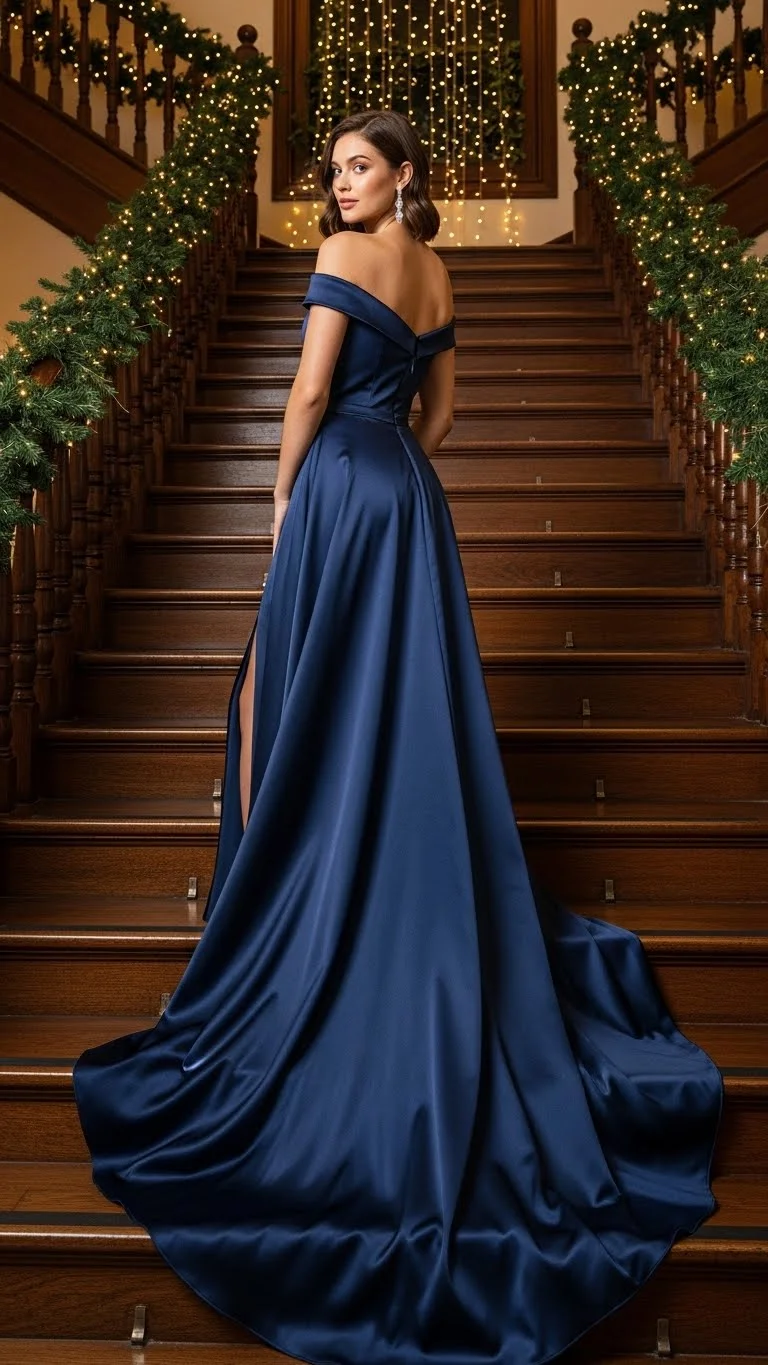Satin gowns reflect light beautifully, adding elegance. A slit adds subtle drama without overcomplicating the look. Pair with silver or nude heels and small earrings. For DIY flair, add a rhinestone pin on the shoulder strap. Hair can be styled in a sleek bun or half-updo. This outfit works for formal indoor parties or photo-friendly events. Navy tones contrast well with holiday décor and are easy to accessorize.