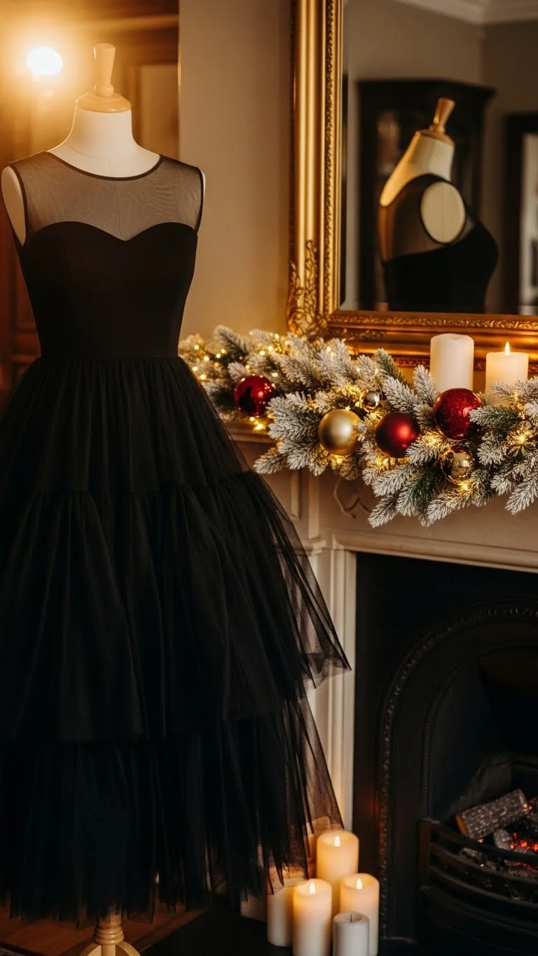 Tulle adds volume and texture without heaviness. Pair with a fitted top or bodice to balance the skirt. Simple black or metallic heels complete the look. For a budget DIY, add a small ribbon belt or pin a festive brooch to the waistline. Hair in a sleek ponytail or soft curls keeps the outfit polished. This look works for formal dinners or semi-formal gatherings. The tulle skirt adds movement and photographs beautifully.