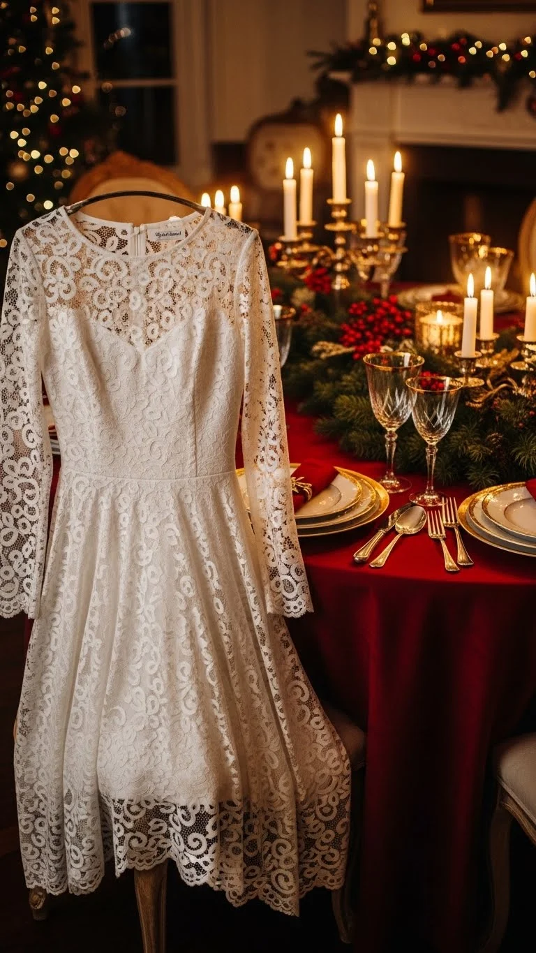 White lace dresses create a soft, delicate look. Long sleeves add warmth and sophistication. Pair with nude or metallic heels and minimal jewelry. If the dress feels plain, add a ribbon or bow at the waistline. Hair in loose waves or a half-up style complements the lace. Perfect for daytime formal events, office parties, or family gatherings. Lace texture adds visual interest without needing bold accessories.
