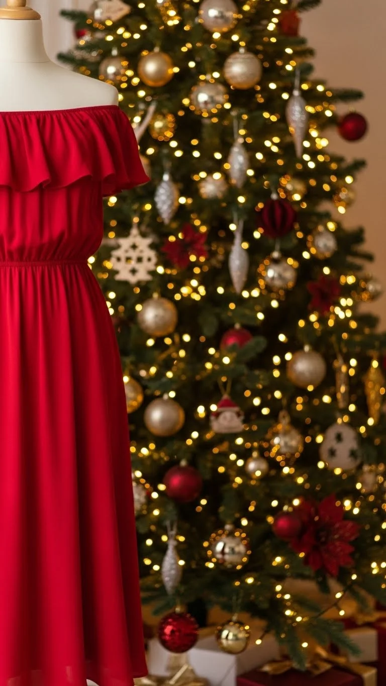 Off-shoulder midi dresses combine elegance and ease. Red is perfect for holiday vibes. Pair with gold heels or nude pumps. Keep jewelry minimal—small hoops or studs work best. For DIY flair, attach a thin metallic belt to define the waist. Hair in loose waves completes the look. Perfect for formal or semi-formal parties. The bright red also stands out in photos against festive backdrops.