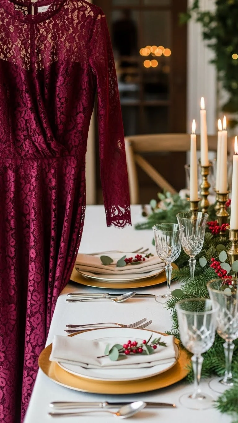 A burgundy lace dress feels classic and warm for winter parties. Long sleeves add a graceful touch without needing extra layers. Look for lace with a simple pattern so it doesn’t feel overwhelming. Add gold earrings or a small necklace to match the warm tone. If the dress feels short, pair it with sheer tights for balance. For a budget DIY upgrade, sew a strip of thin velvet ribbon around the waist. Burgundy pairs well with nude, gold, or black heels. Carry a gold clutch or a small black bag. If lace feels delicate, use a slip underneath to keep the look smooth. For hair, soft curls or a half-up style match the romantic feel. This outfit fits both small family parties and larger venues.