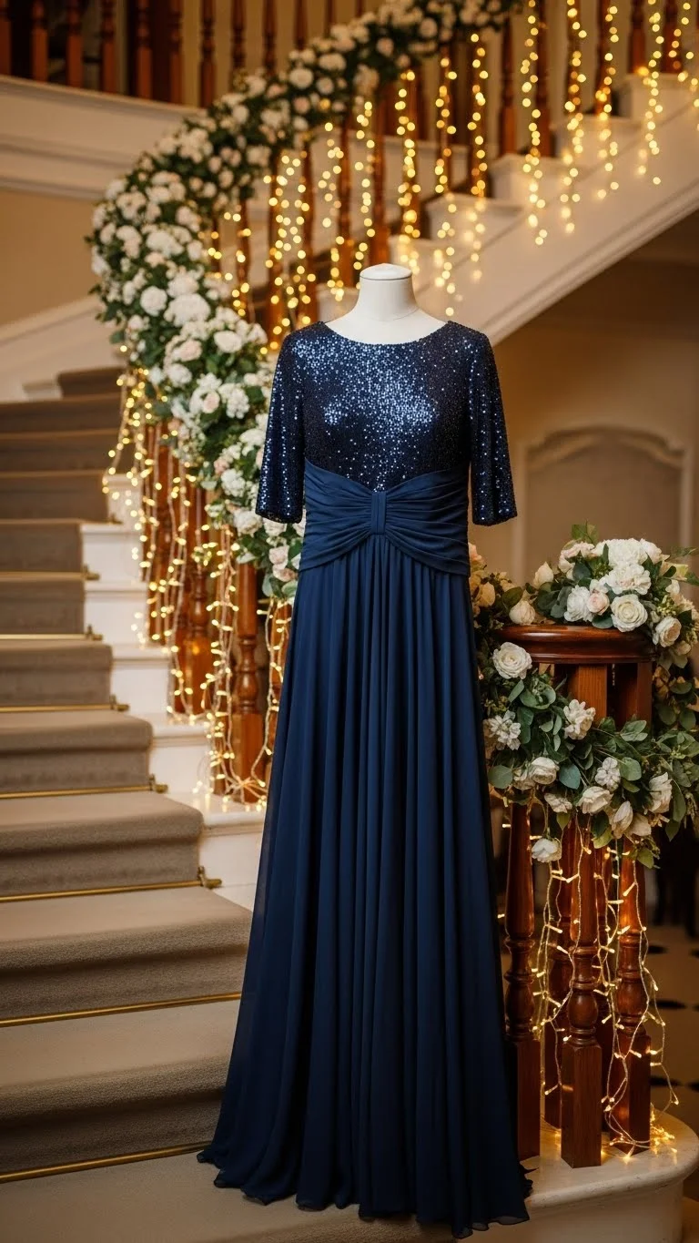 A navy gown with a sequined top balances sparkle and structure. Choose a gown with a simple skirt to keep the look grounded. Add silver jewelry to match the cool tone. If the sequins feel too bold, wear your hair down to soften the effect. You can also DIY some sparkle by adding sequins to the waistband if the bodice is plain. Navy works well with silver heels or nude shoes. A silver clutch completes the outfit without overpowering it. Tighten the waist with a ribbon if you want more shape. This outfit fits ballroom, hotel, or home parties. The sequins reflect party lights in a flattering way.