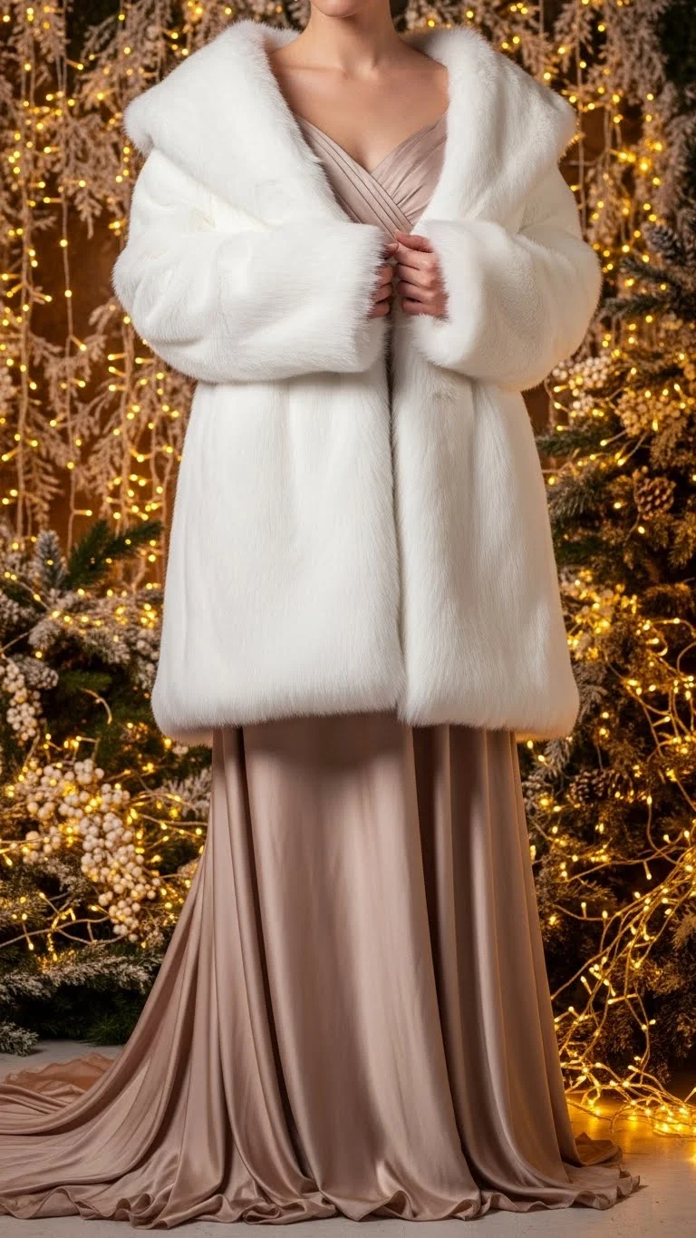 A faux-fur coat instantly adds glamour to a plain gown. Choose white or cream for a wintery look. Underneath, wear any simple dress—black, nude, red, or champagne all work. This trick helps you dress up without buying a new gown. Add pearl or gold earrings to match the coat’s softness. Carry a gold or white clutch. For shoes, nude or metallic heels work well. If the coat feels too bulky, drape it over your shoulders instead of wearing it fully. You can also pin a small brooch to the coat for personality. This combination looks expensive but can be done on a budget with thrifted pieces. Hair can be styled in soft waves or a clean bun.