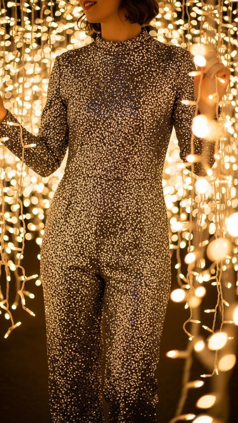 A glitter jumpsuit brings shine without going overboard. Keep the accessories clean and minimal. Choose heels in black or nude. If the jumpsuit runs long, fold the hem or use temporary fabric tape. Glitter fabrics often appear in seasonal sales. This outfit works well for lively parties or New Year-style celebrations.