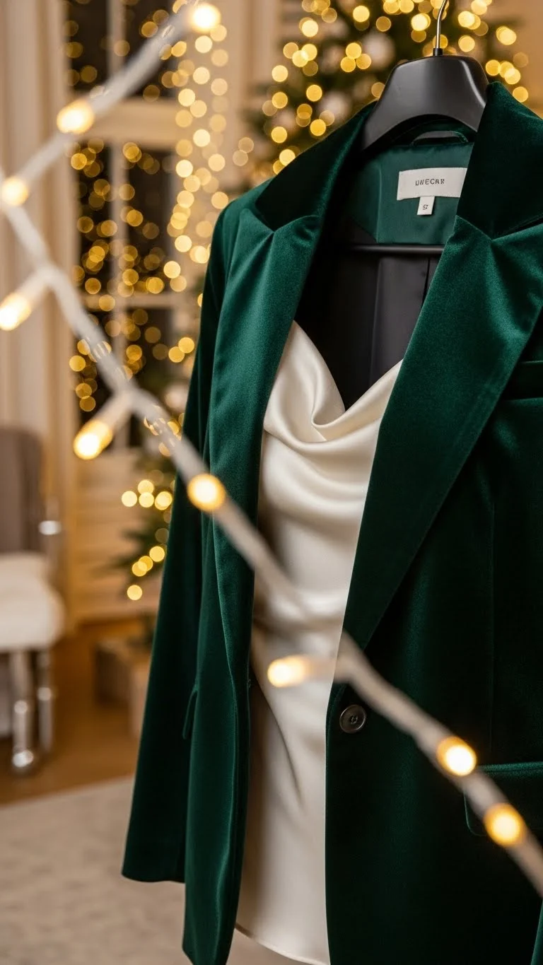 A velvet jumpsuit creates an elegant shape with very little styling. Choose one with a cinched waist or add a thin belt. Dark green, wine, or black velvet works well for holiday settings. You can pair it with simple earrings and strappy heels. Many velvet jumpsuits go on sale in early winter, so it’s easy to find an affordable one. If the length feels too long, cuff the hem neatly or use fabric tape for a quick fix. This outfit suits cocktail parties and evening gatherings.