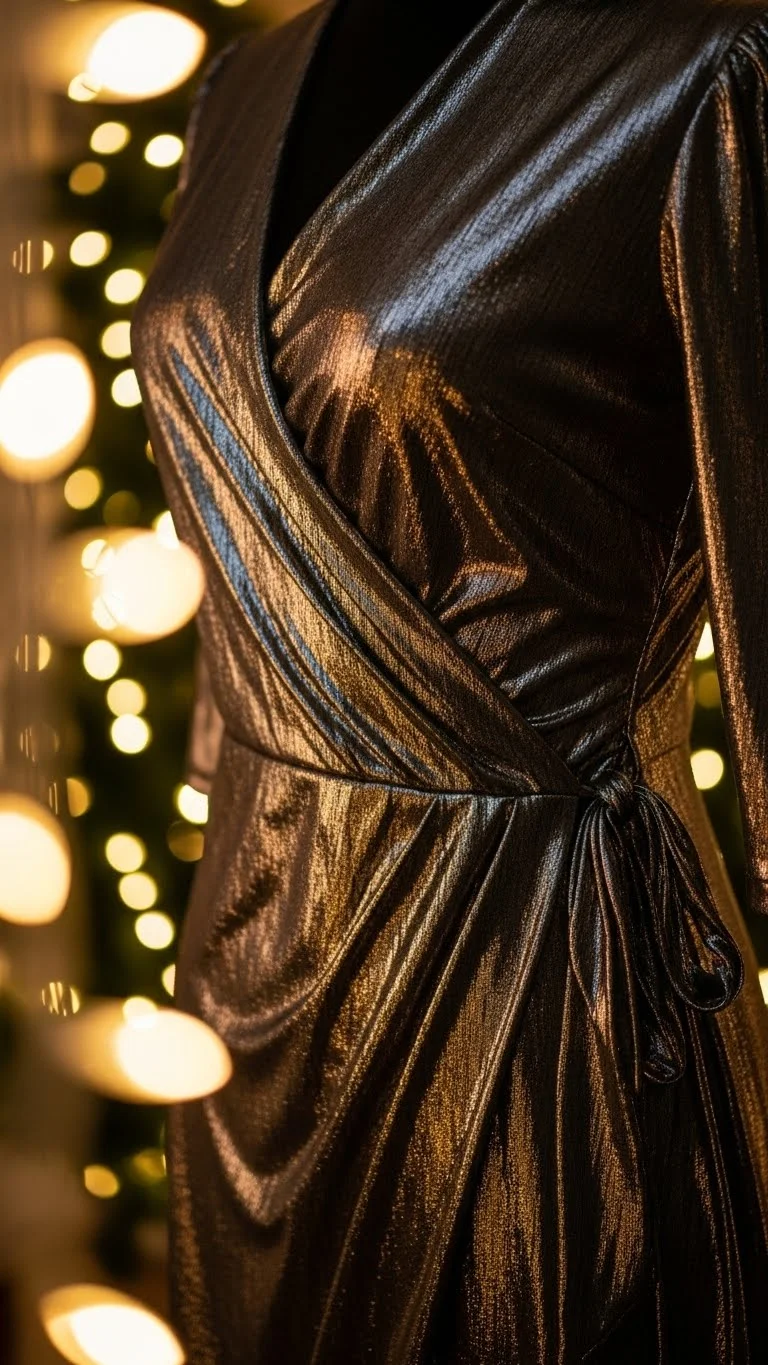 A metallic wrap dress gives shape and shine. Choose gold, silver, or bronze depending on your style. Pair with simple heels. Adjust the wrap tie to fit comfortably. You can steam the dress lightly to smooth the fabric. This outfit often looks more expensive than it is. Works for formal or semi-formal events.