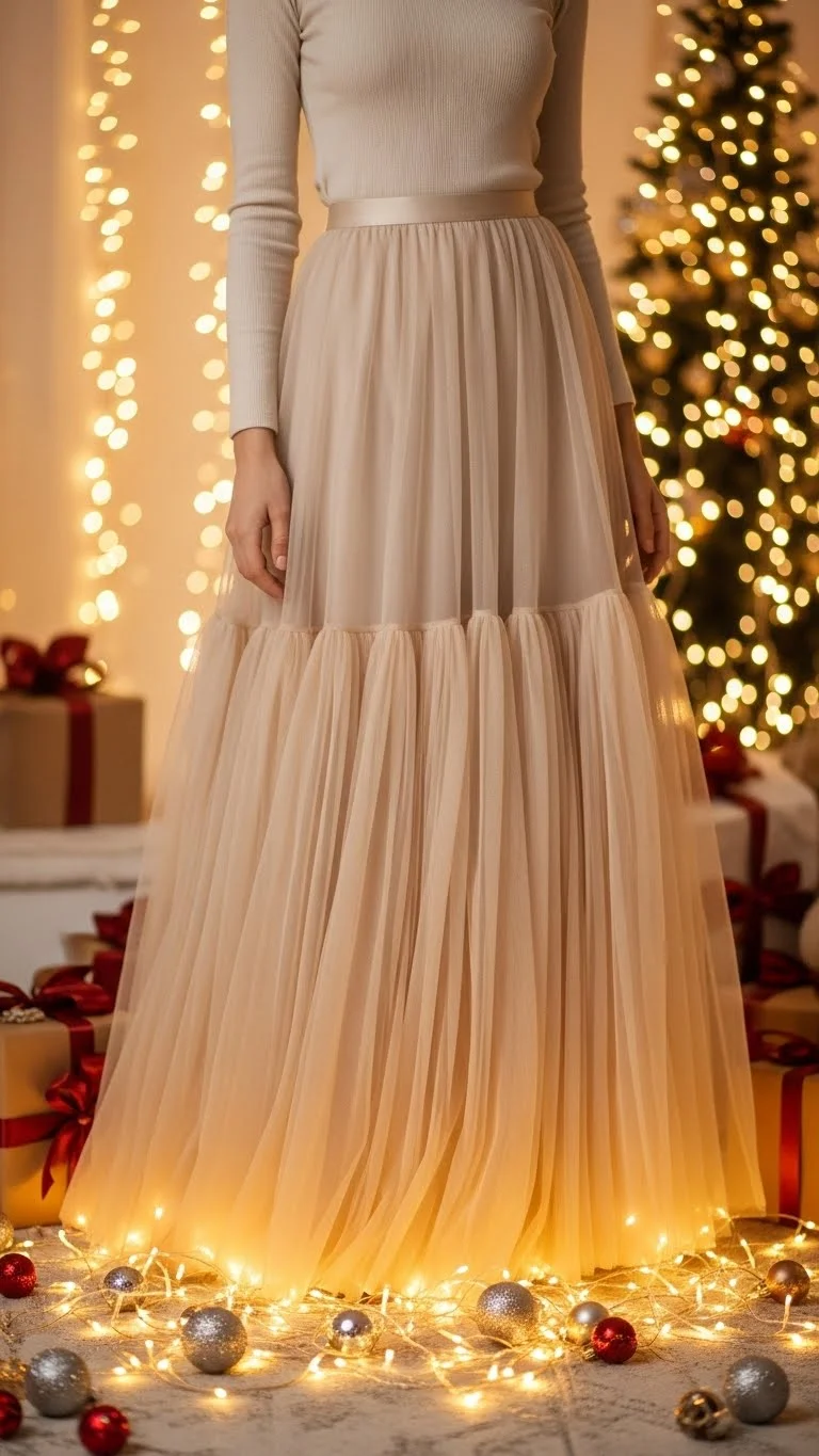 A tulle skirt looks whimsical yet glamorous. Pair it with a fitted top to balance the volume. Choose neutral or metallic shades. Add a thin belt if you want more shape. Tulle skirts can be refreshed by steaming lightly. This outfit suits classy or playful holiday gatherings.