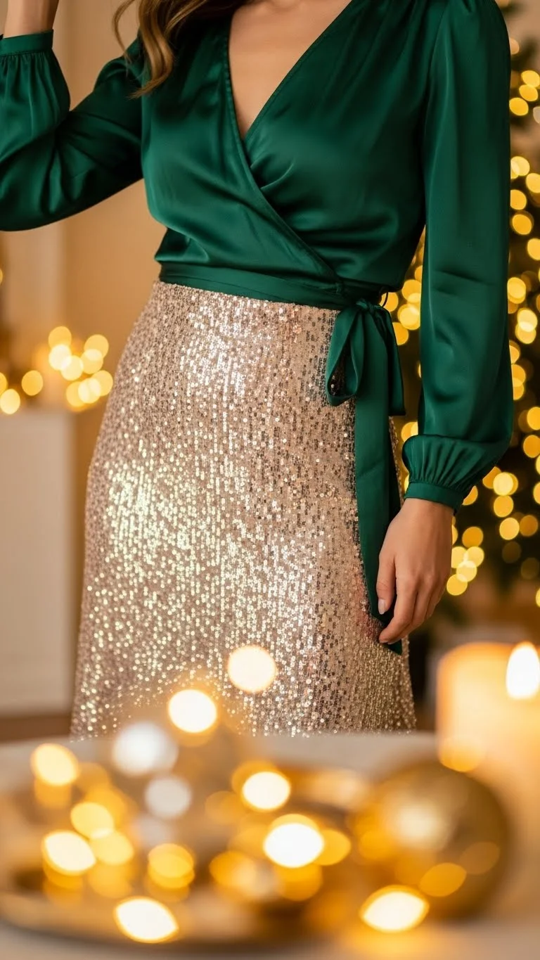 A wrap top creates a flattering line. Pair it with a sequined skirt for shine. Choose simple accessories. You can pin the wrap front for comfort. Sequined skirts often go on sale near Christmas. This outfit suits semi-formal or festive evening gatherings.