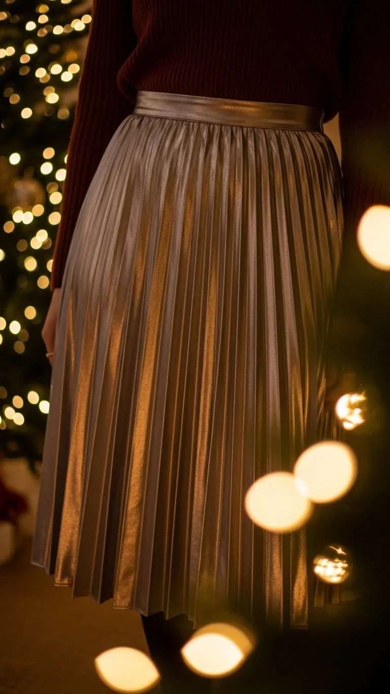 A metallic skirt adds shine without feeling heavy. Silver, gold, or rose-gold skirts pair well with fitted knit tops. Stick to simple colors so the skirt stays the focus. You can tuck the top lightly to shape the waist. If the skirt feels stiff, steam it for a smoother flow. Check holiday sales for metallic pieces—they’re often marked down early. This outfit works for semi-formal parties.