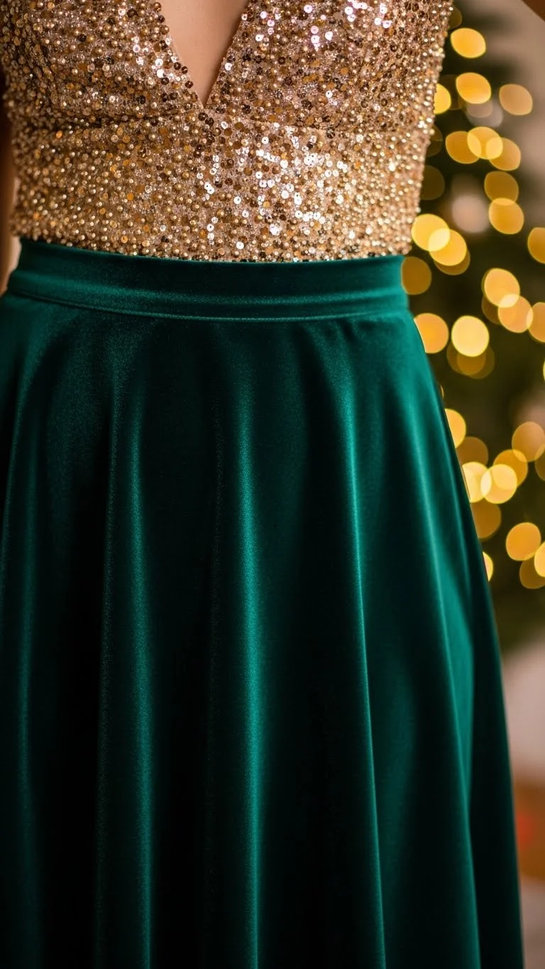 A velvet skirt feels rich and smooth. Pairing it with a sparkly bodysuit gives the outfit balance. Choose darker velvet so the shine from the bodysuit stands out. Add heels or ankle boots. You can adjust the bodysuit straps for a better fit. Velvet skirts are easy to find in thrift stores or clearance racks. This outfit works for lively party settings.