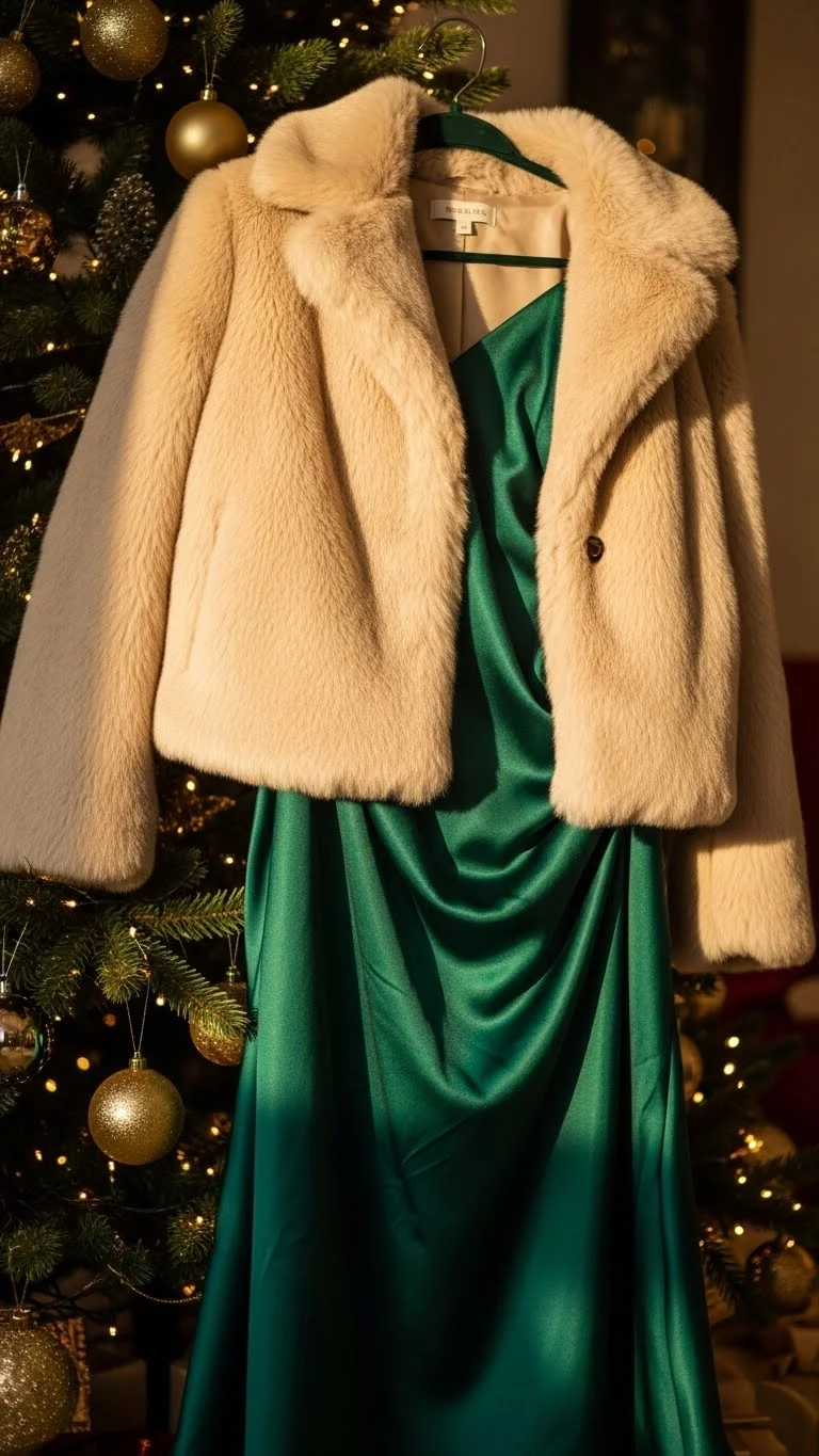 A satin slip dress looks polished without much effort. Pair it with a fuzzy shawl or faux-fur wrap for warmth and texture. Neutral shades work well, but ruby or emerald add a festive touch. You can dress it up with a thin necklace or sparkly earrings. If your slip dress feels too plain, layer a lace bralette underneath. Budget tip: thrift stores often have satin pieces for low prices. This outfit works well for evening parties.