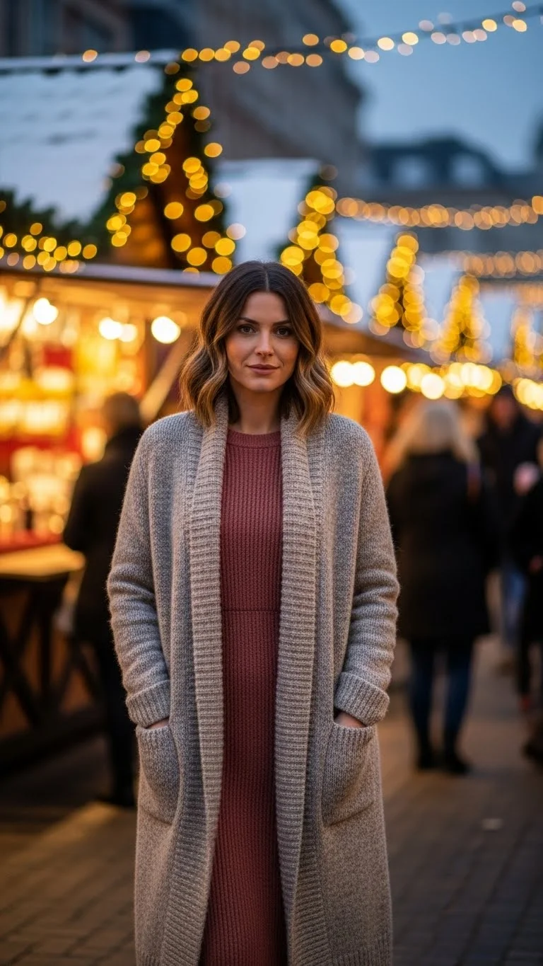 A cardigan layered over a knit dress adds cozy sophistication. Choose muted reds, greens, or neutrals to feel festive without being too bright. Boots or heels complete the ensemble. DIY tip: use a belt over the cardigan to define your waist. Works well for casual dinners, office parties, or winter walks.