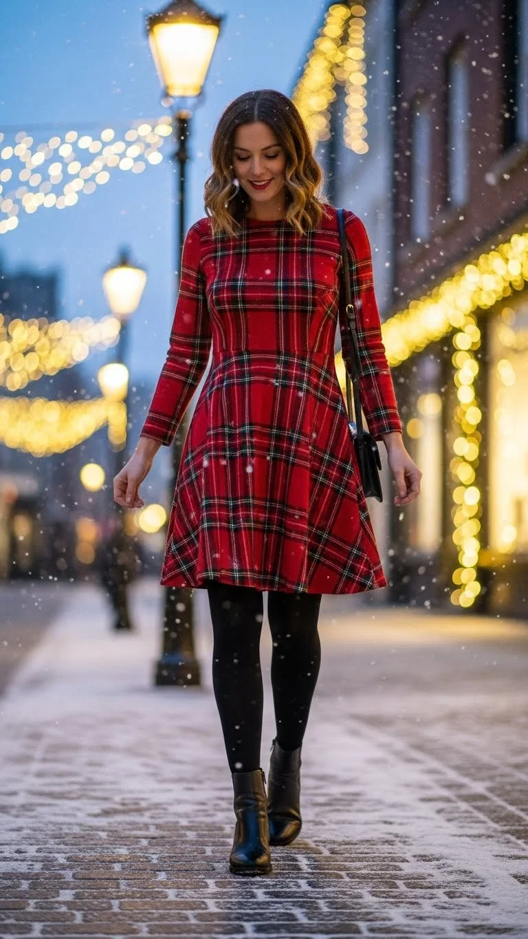 A red plaid dress feels classic and festive. Pair with black tights for warmth and boots for style. Minimal accessories, like stud earrings or a thin bracelet, keep the look clean. Perfect for daytime holiday events or casual dinner parties.