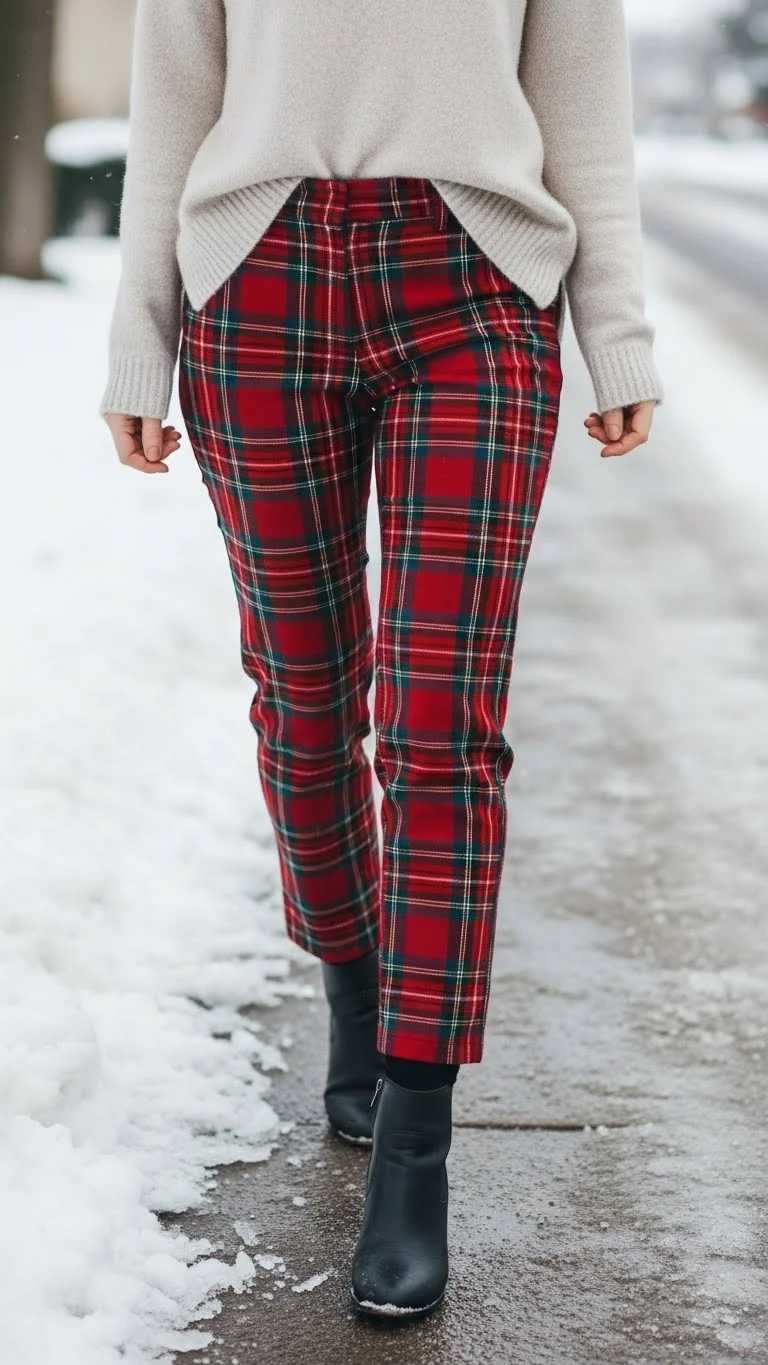 A cream sweater with plaid pants gives balance to a bold bottom. Keep shoes simple and accessories minimal. DIY tip: roll up sleeves or add a holiday brooch for a subtle touch. Ideal for casual family gatherings or daytime events.
