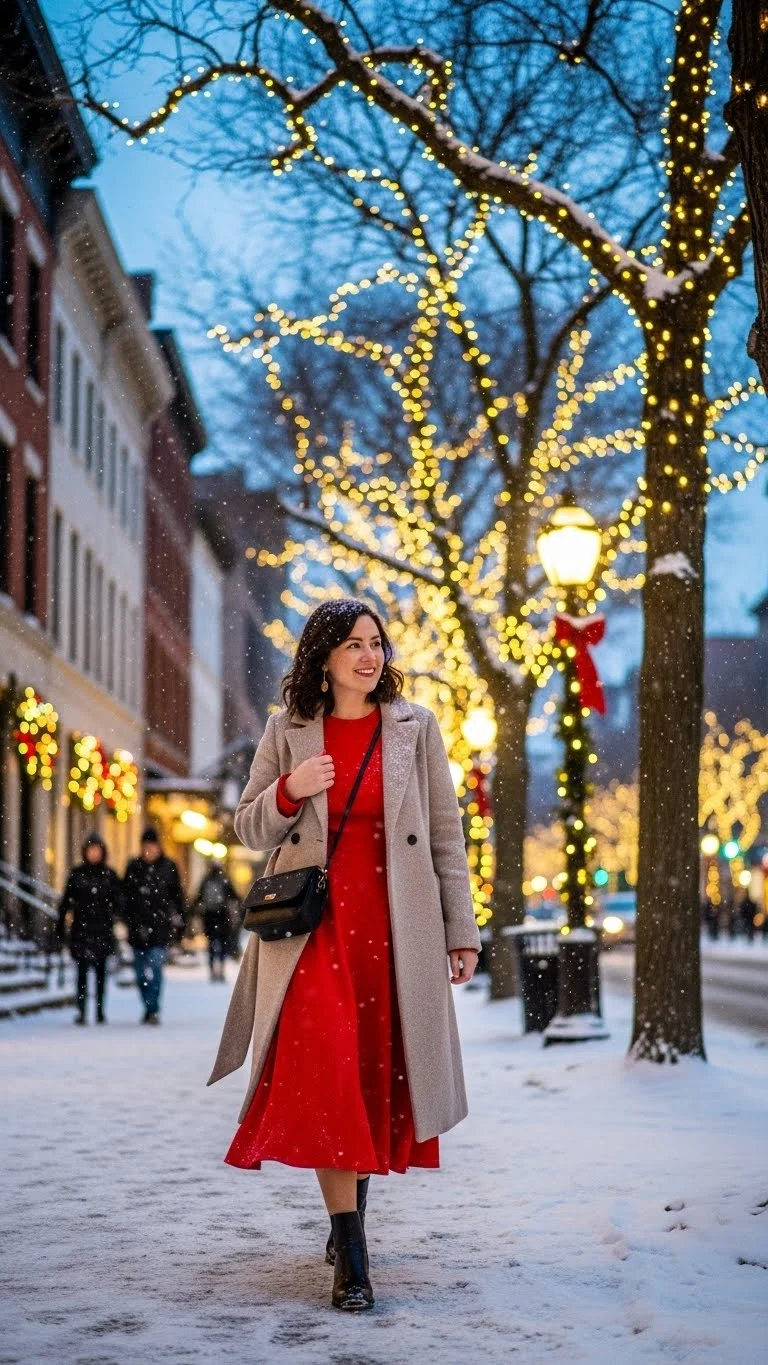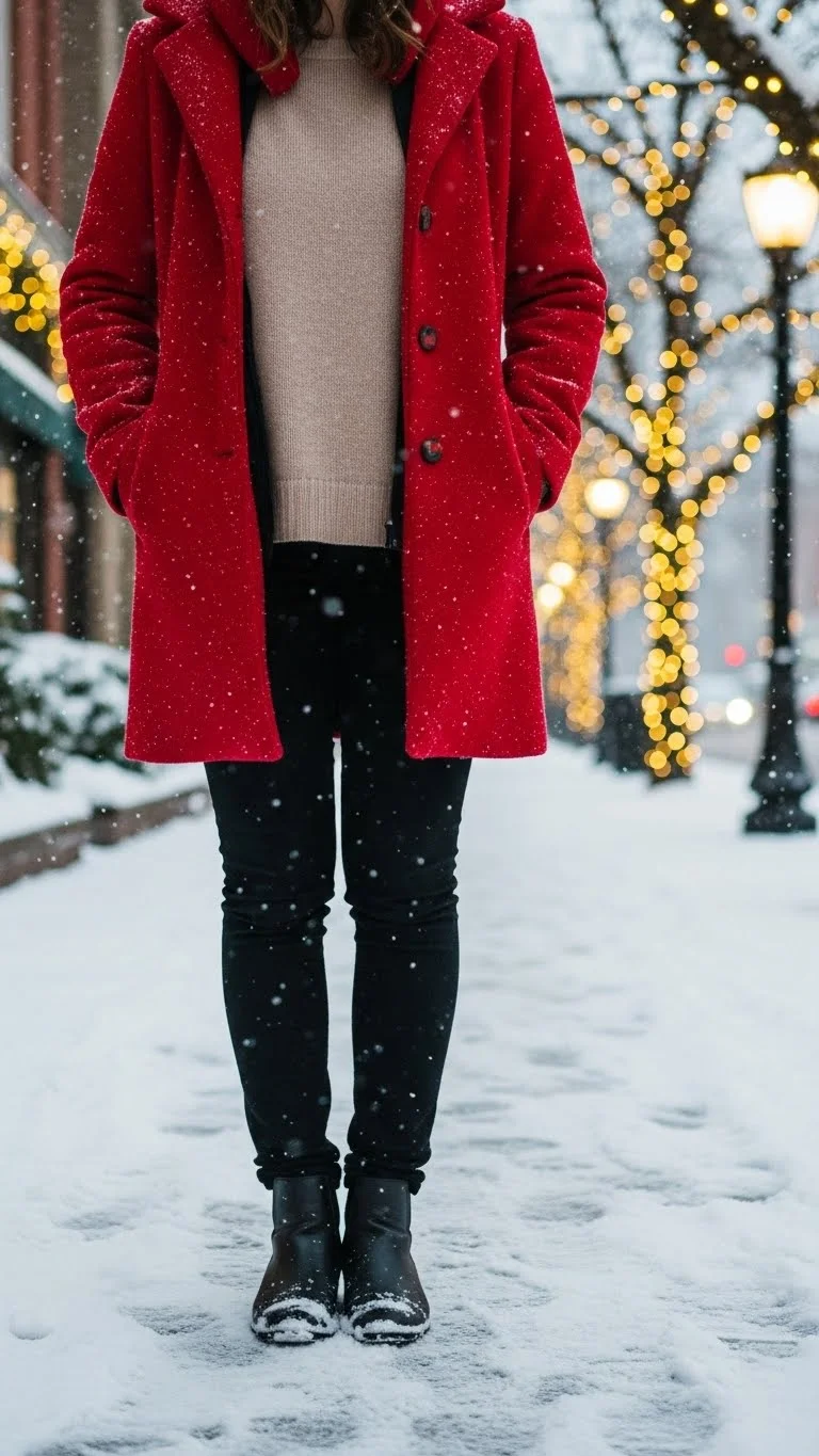 A red coat instantly adds festive color. Pair with a neutral outfit underneath to make it pop. Boots or sneakers work depending on weather. Budget-friendly: use a thrifted coat or add a red scarf to your wardrobe. Perfect for casual holiday outings.