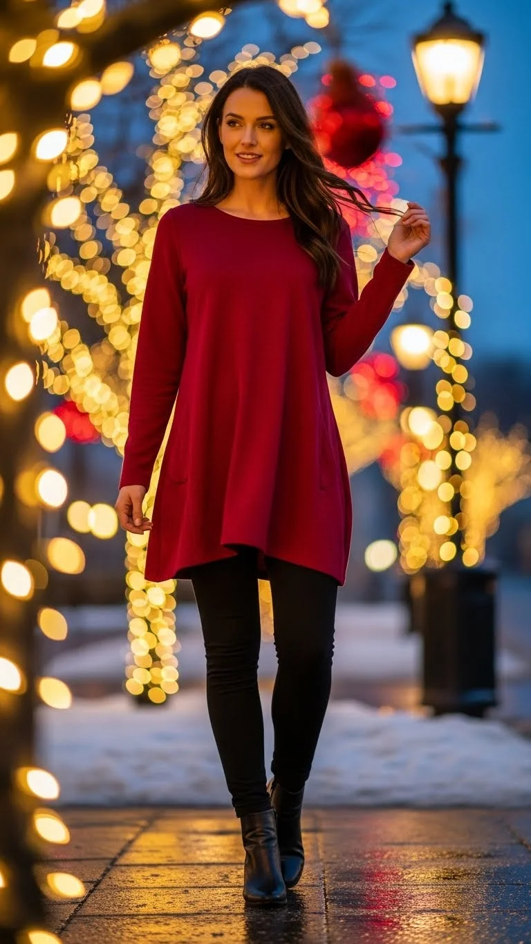 A red tunic with leggings is comfortable yet festive. Add boots and minimal jewelry for balance. DIY: layer an oversized sweater as a tunic over leggings. Works for casual holiday shopping trips or family gatherings.