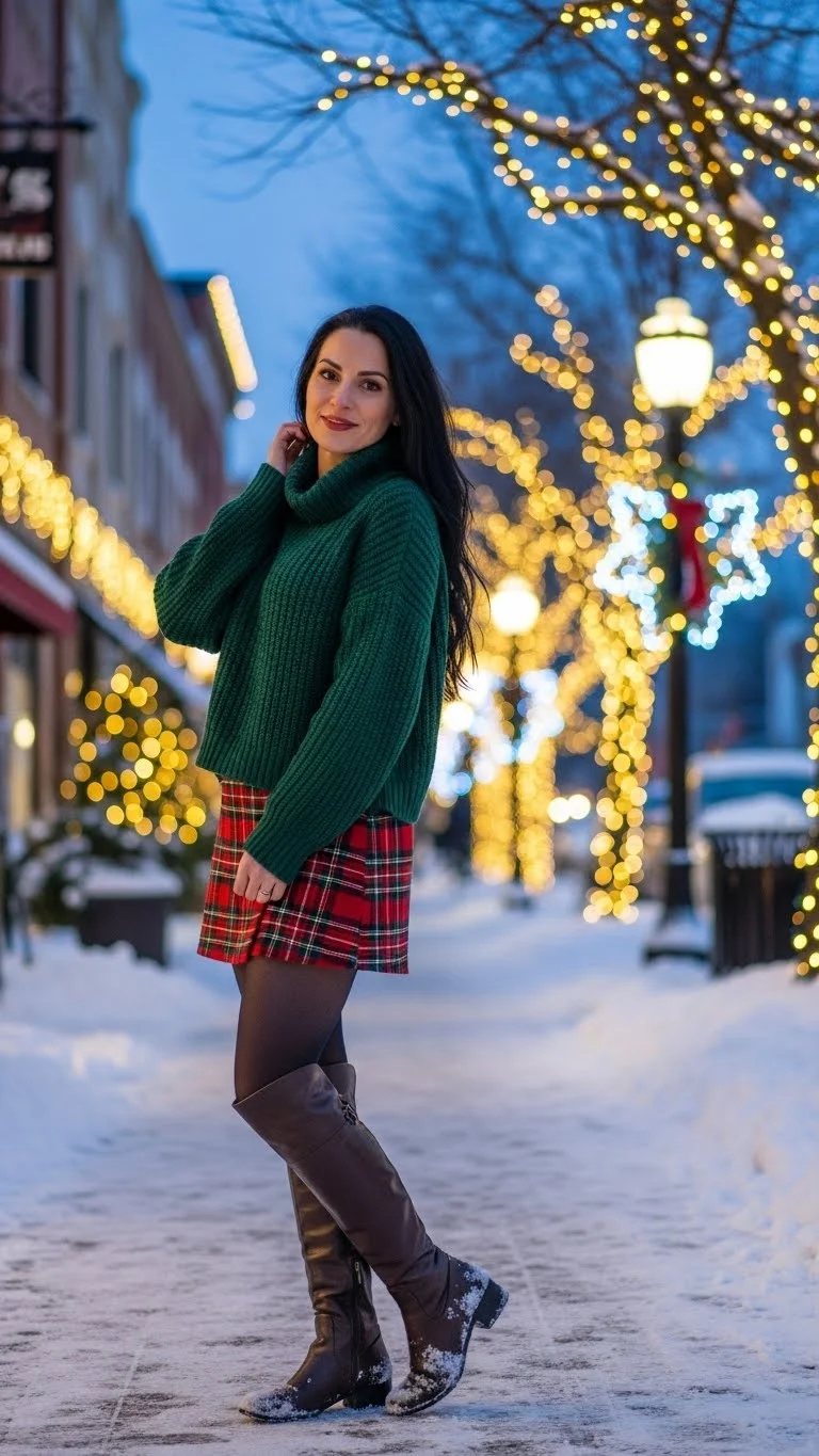 Layering a plaid shirt under a sweater adds visual interest without much effort. Keep the bottom simple with jeans or leggings. Boots complete the cozy, festive look. If you don’t have a plaid shirt, consider DIYing a pocket scarf or plaid sash. Perfect for office events, casual family dinners, or strolling through holiday markets.