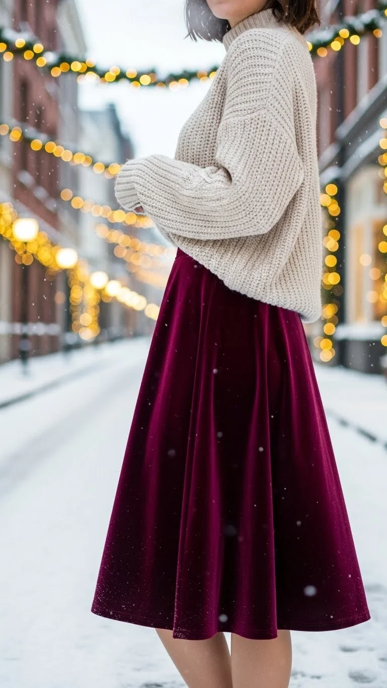 A velvet skirt brings texture and warmth. Pair with a knit top for balance. Boots or heels complete the look. DIY tip: thrift velvet skirts for an affordable option. Perfect for evening dinners or holiday parties.