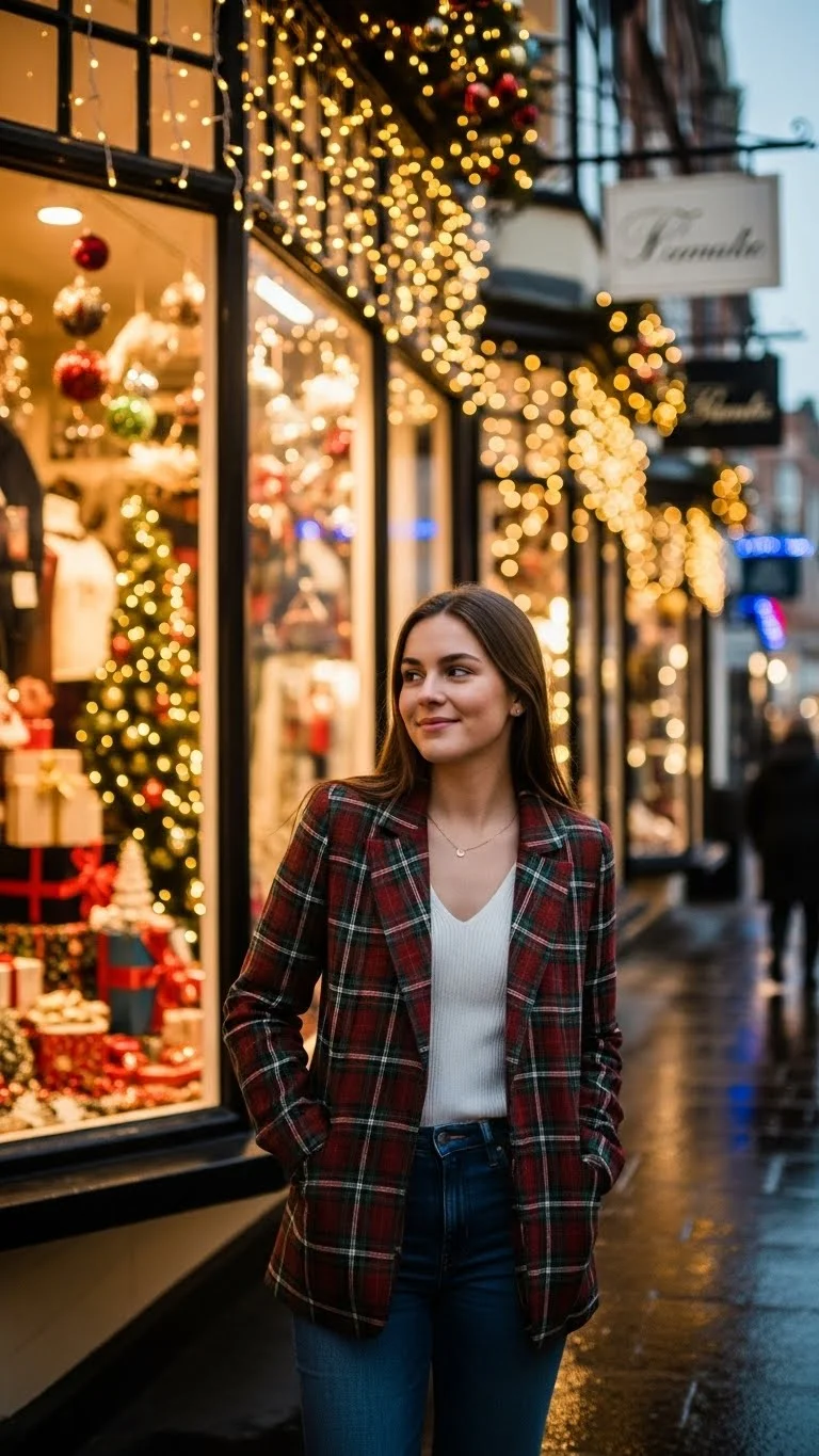 A plaid blazer with jeans is casual yet festive. Pair with boots or loafers. Minimal accessories let the pattern shine. Affordable tip: thrift plaid blazers or use scarves for a similar vibe. Works for casual dates or office events.