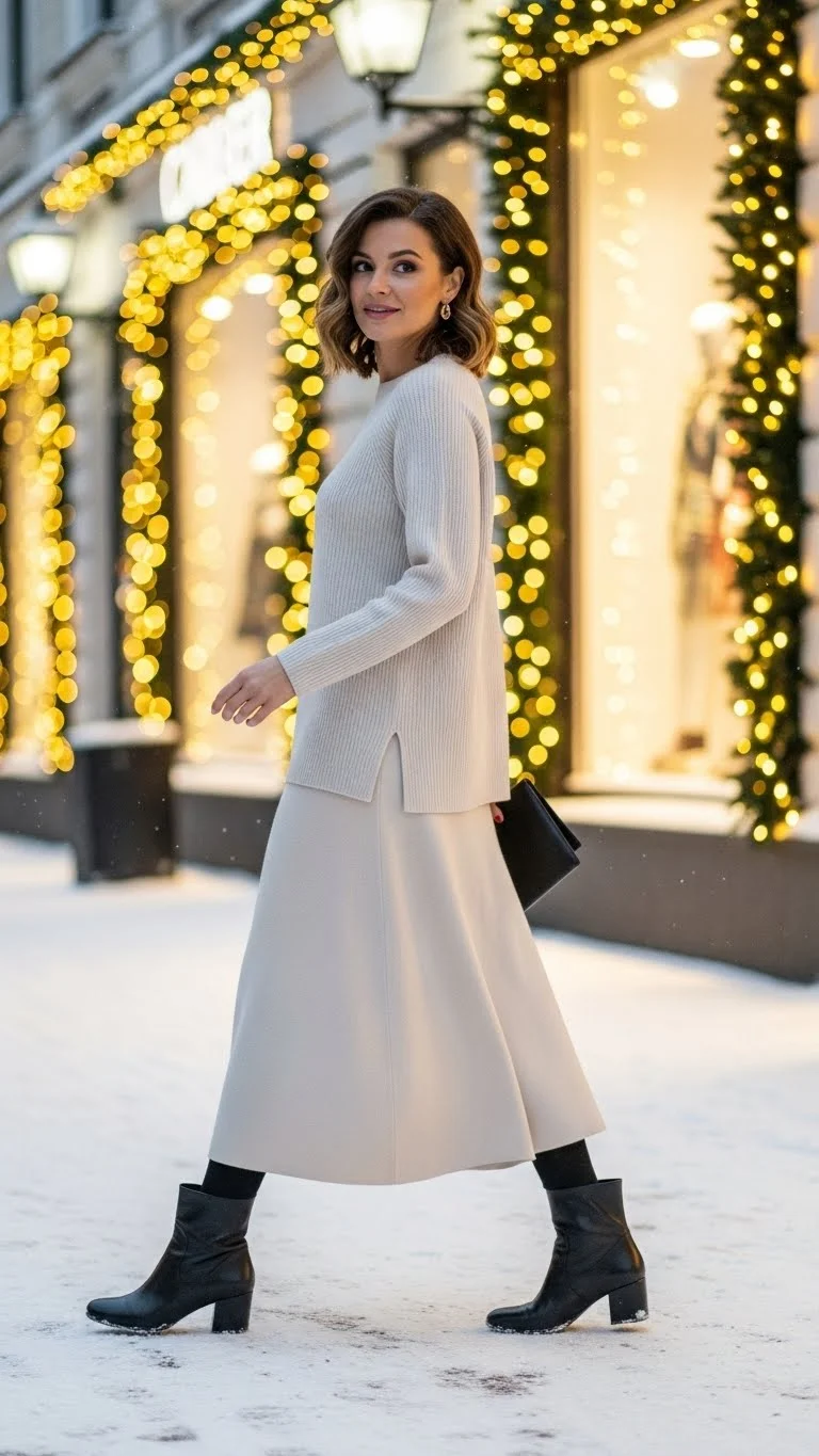 A cozy knit set creates a put-together look effortlessly. Pair with boots and minimal accessories. DIY: repurpose sweater and skirt from separate thrifted pieces. Perfect for casual gatherings, holiday brunches, or strolls through decorated streets.
