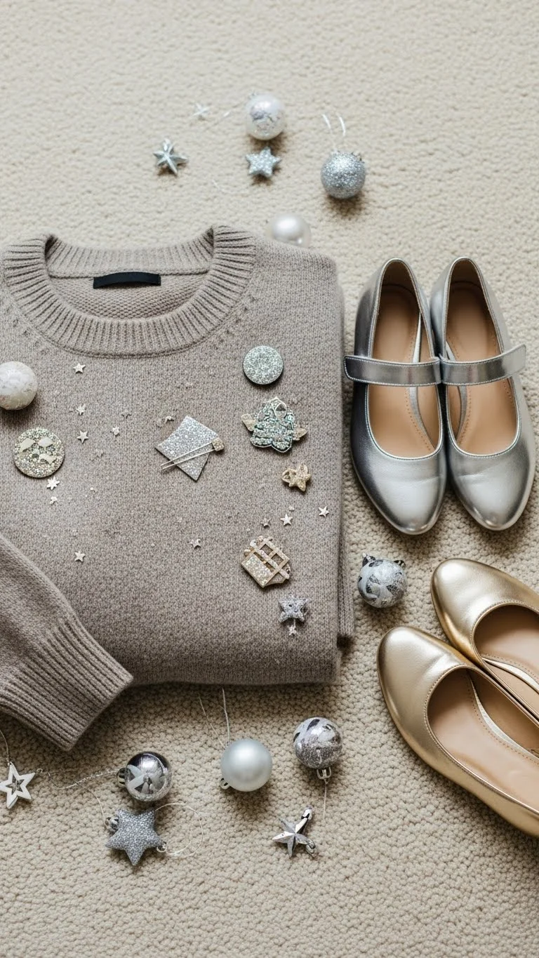 A little shimmer goes a long way. Add metallic shoes, glittery pins, or subtle sequins to an otherwise neutral outfit. DIY options include sewing or gluing small sequins onto a scarf or sweater. Works for evening parties or holiday photos. You’ll look festive without overdoing it.