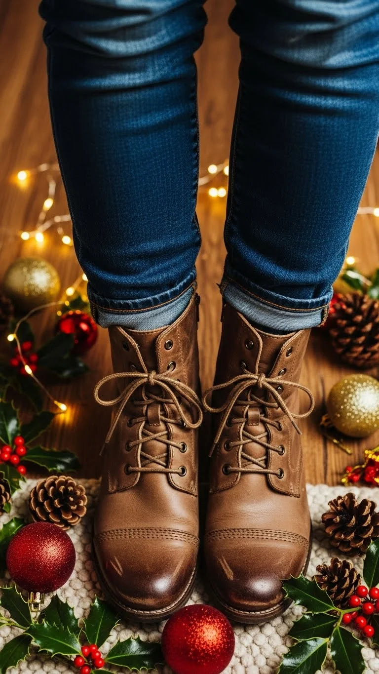 Tucking jeans into boots instantly elevates casual outfits. Choose brown or black leather boots for a polished look. Affordable options are widely available online. Works with sweaters, shirts, or casual jackets. Simple, stylish, and perfect for outdoor holiday gatherings.