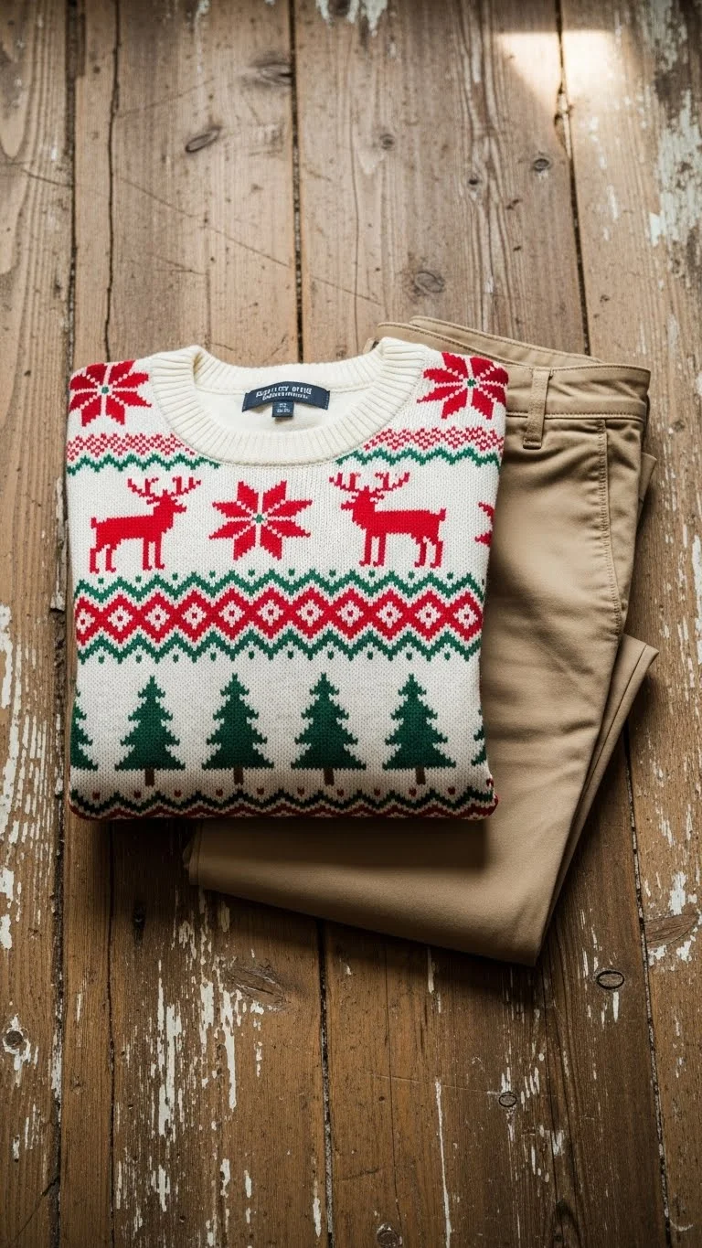 Patterned sweaters bring seasonal cheer. Pair with khakis for a comfortable, put-together look. Affordable sweaters are easy to find online. DIY embroidery or buttons personalize it. Perfect for casual gatherings or office events. Warm, cheerful, and festive.