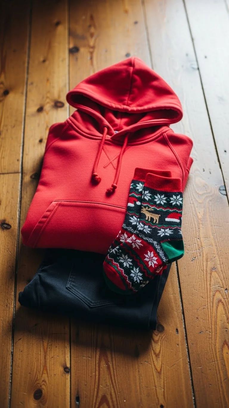 Add a pop of fun with patterned socks. Pair a casual hoodie with neutral pants. Affordable hoodies are available online, and socks can be DIY or bought cheaply. Ideal for casual family gatherings or lounging. Playful, comfortable, and festive.