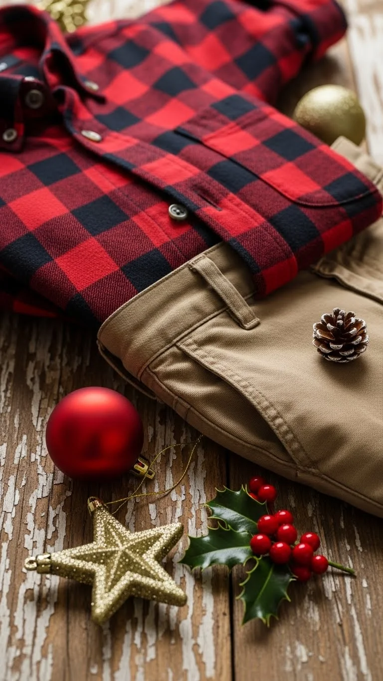 Red flannel shirts are a classic holiday choice. Pair with khakis for a smart-casual outfit. Affordable flannels and khakis are widely available. DIY touches like a small embroidered motif add personality. Perfect for casual gatherings, outdoor events, or family dinners. Simple, festive, and comfortable.