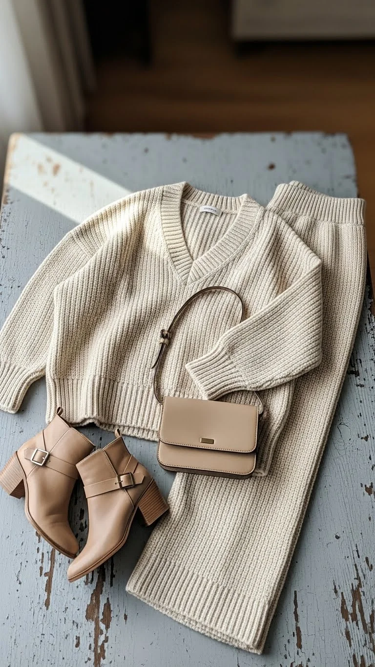 Wide-leg pants with chunky knits create relaxed yet structured outfits. Budget: thrift pants or repurpose tops creatively. Ideal for dinners or casual gatherings. This trend prioritizes comfort while maintaining a polished holiday look.