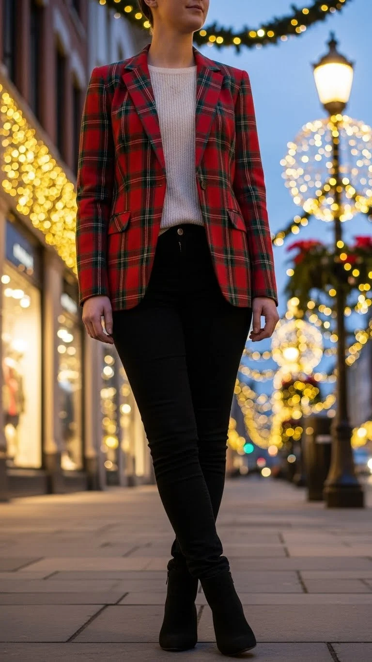 Plaid blazers are versatile and festive. Pair with jeans or trousers and minimal accessories. Affordable tip: thrift a vintage blazer or DIY add patches for extra charm. Works well for casual office parties or daytime gatherings. Plaid adds seasonal color, structure, and effortless style.