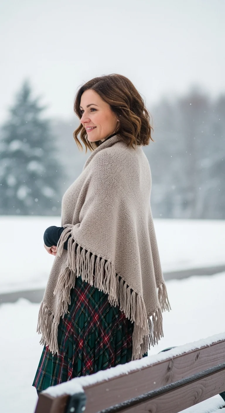 A knit poncho with a skirt is effortless and warm. Pair with boots or flats. Budget tip: Ponchos are affordable online or in thrift stores. DIY: Add fringe or embellishments. Works for casual holiday outings or outdoor gatherings.
