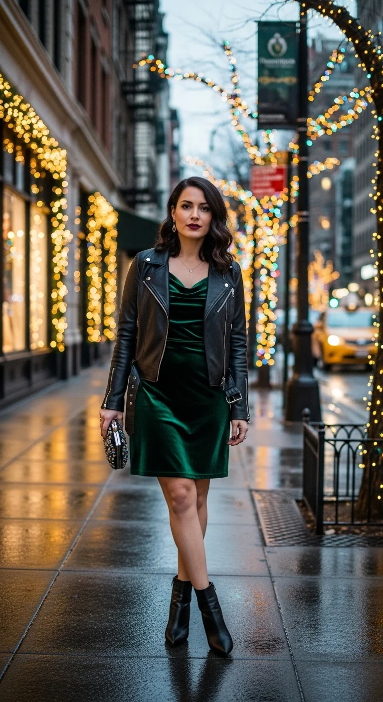 A leather jacket over a festive dress adds edge to holiday style. Pair with boots or heels. Budget tip: Thrift stores offer leather jackets under $50. DIY: Add studs or small patches. Perfect for evening parties or casual night events.