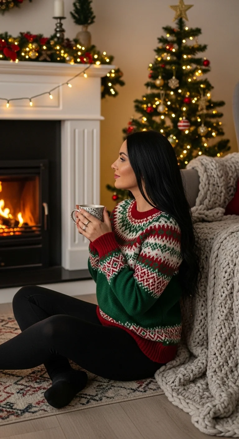 A Fair Isle sweater with leggings is playful and cozy. Boots or slippers complete the outfit. Budget tip: Thrift stores often carry festive sweaters. DIY: Add small felt designs or sequins for extra charm. Perfect for relaxed family gatherings or holiday movie nights.