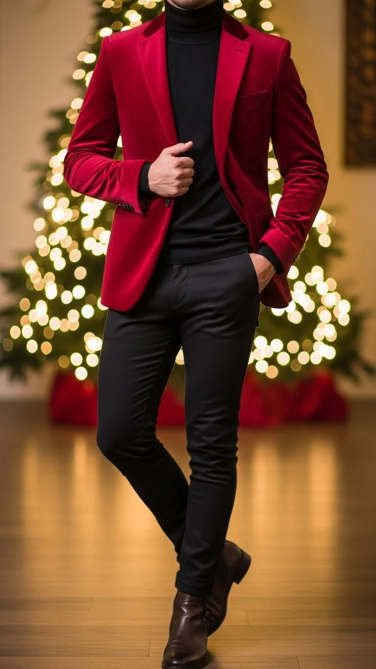 A red velvet blazer adds instant festive charm. Pair it with a black turtleneck and slim trousers for balance. Accessories like a sleek watch or simple earrings finish the look. Budget tip: thrift blazers or DIY by adding embellishments to an old jacket. Perfect for dinners, holiday parties, or evening strolls. This trend combines luxury textures with everyday wear, making it versatile and cozy.