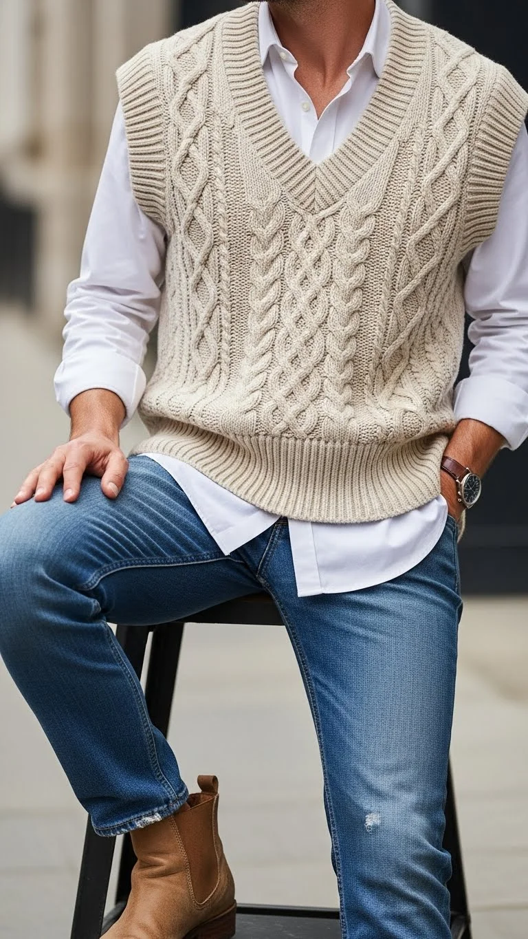 Cable knit vests layered over shirts are trending for structured, warm outfits. Budget tip: repurpose old sweaters by cutting them into vests. Works for casual brunches or indoor gatherings. This trend adds texture and dimension without bulk.