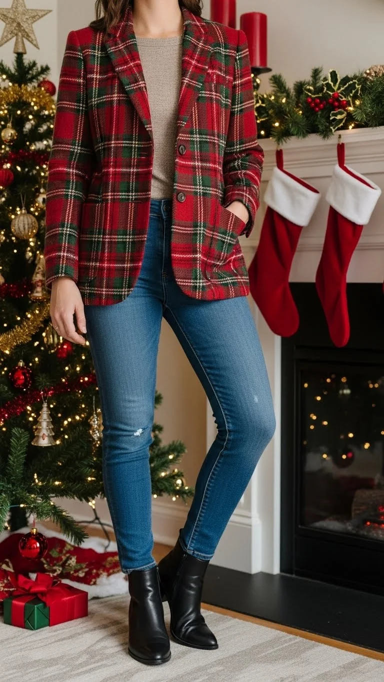 Plaid blazers are perfect for holiday layering. Pair with jeans or trousers for casual sophistication. Budget-friendly: thrift vintage blazers or add patches for DIY appeal. Works well for dinners, work parties, or casual events. Plaid adds seasonal color and a structured silhouette, keeping your look polished yet festive.