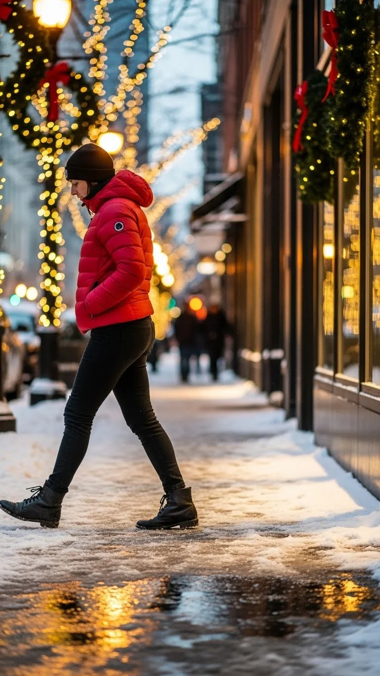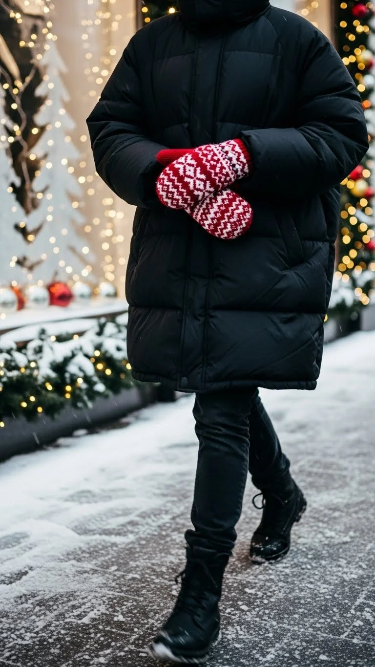 Chunky snow boots make winter outfits practical and fun. Pair them with a festive sweater for a warm Christmas street look.