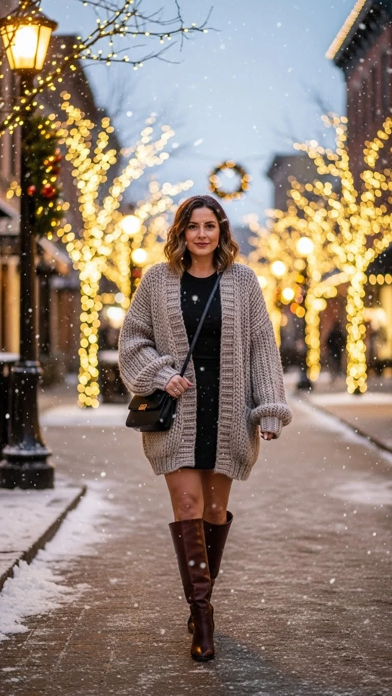 An oversized cardigan always feels relaxed. Pair it with knee-high boots for a balanced street look.